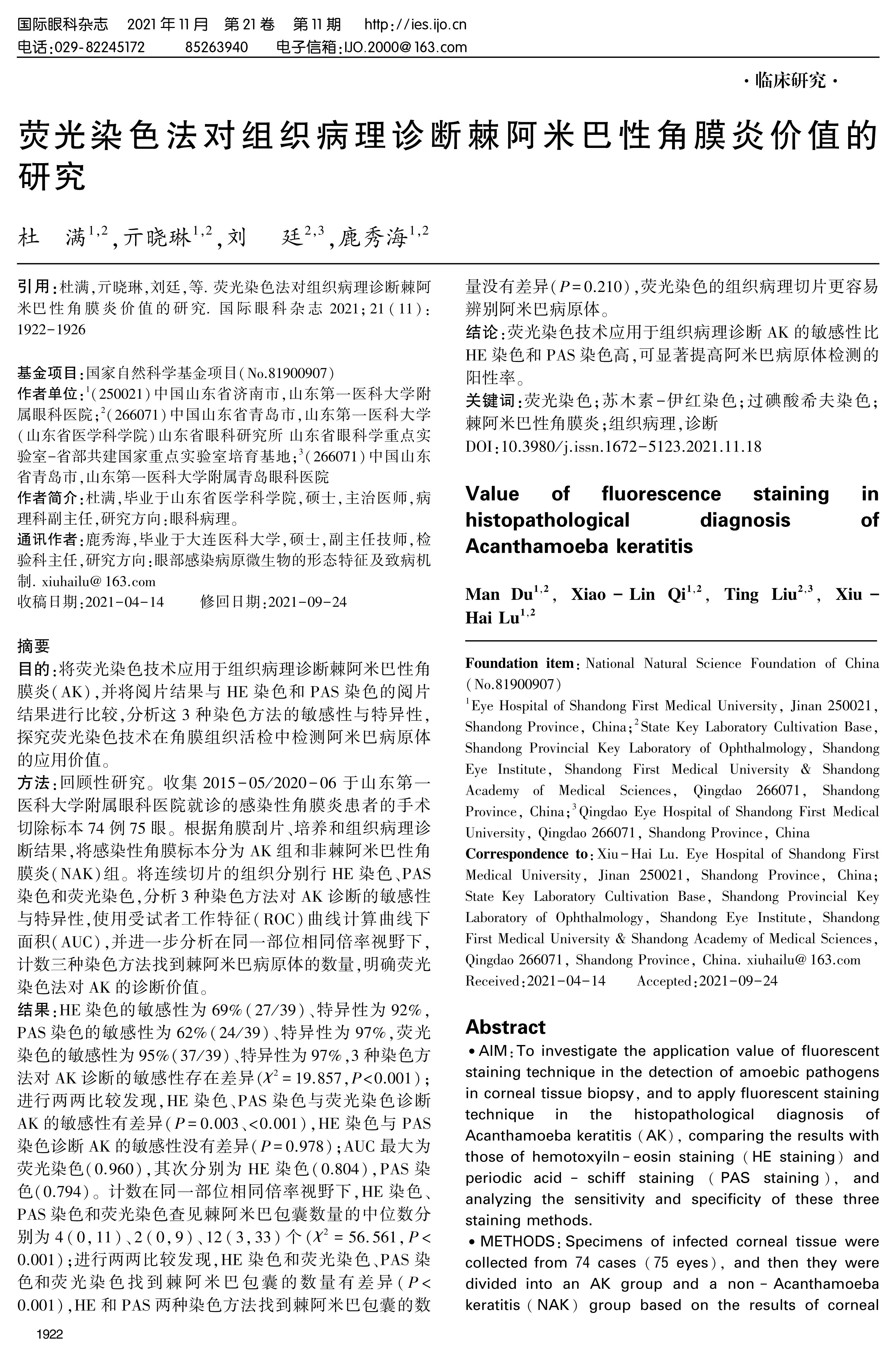 AIM:To investigate the application value of fluorescent staining technique in the detection of amoebic pathogens in corneal tissue biopsy, and to apply fluorescent staining technique in the histopathological diagnosis of Acanthamoeba keratitis(AK), comparing the results with those of hemotoxyiln-eosin staining(HE staining)and periodic acid-schiff staining(PAS staining), and analyzing the sensitivity and specificity of these three staining methods.METHODS:Specimens of infected corneal tissue were collected from 74 cases(75 eyes), and then they were divided into an AK group and a non-Acanthamoeba keratitis(NAK)group based on the results of corneal scraping, culture and histopathological diagnosis. The tissues of consecutive sections were stained with HE staining, PAS staining and fluorescence respectively, and the sensitivity and specificity of the three staining methods for the diagnosis of AK were analyzed. Area under the curve(AUC)was calculated using the receiver operating characteristic(ROC)curve. Further analysis was performed to count the number of Acanthamoeba pathogens found by the three staining methods under the same magnification field of view at the same site, and to clarify the diagnostic value of fluorescent staining technique for AK.RESULTS: The sensitivity of HE staining was 69%(27/39)with a specificity of 92%; the sensitivity of PAS staining was 62%(24/39)with a specificity of 97%, and the sensitivity of fluorescent staining was 95%(37/39)with a specificity of 97%. There were differences in the sensitivity of the three staining methods for the diagnosis of AK(χ2=19.857, P<0.001), and pairwise comparison revealed that the differences between HE staining and fluorescent staining, PAS staining and fluorescent staining for the diagnosis of AK were statistically significant(P=0.003,<0.001), while the difference in sensitivity between HE staining and PAS staining for the diagnosis of AK was not statistically significant(P=0.978). The maximum AUC was 0.960 for fluorescence staining, followed by 0.804 for HE staining and 0.794 for PAS staining, respectively. The median number of amoeba cysts detected by HE staining, PAS staining and fluorescent staining at the same site under the same magnification field of view was 4(0, 11), 2(0, 9)and 12(3, 33), respectively(χ2=56.561, P<0.001). Pairwise comparison revealed that the differences in the number of amoeba cysts found by HE staining and fluorescence staining, PAS staining and fluorescence staining were statistically significant(P<0.001), while the difference in the number of amoeba cysts found by HE staining and PAS staining was not statistically significant(P=0.210). Fluorescently stained histopathological sections make it easier to identify amoebic pathogens.CONCLUSION:Fluorescent staining technique is more sensitive to histopathological diagnosis of AK than HE staining and PAS staining, which can significantly improve the positive rate of detection of amoebic pathogens.