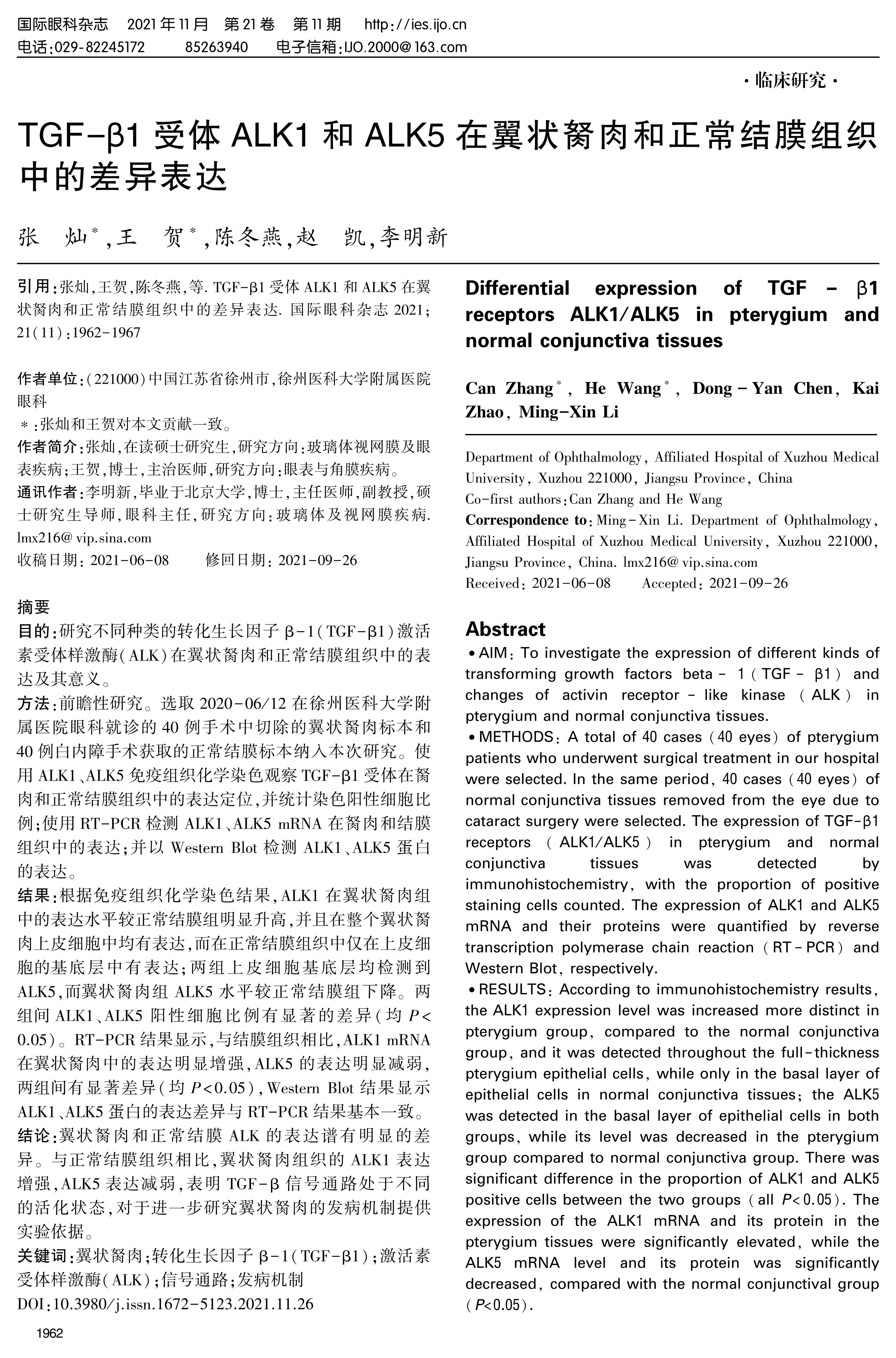 目的:研究不同种类的转化生长因子β-1(TGF-β1)激活素受体样激酶(ALK)在翼状胬肉和正常结膜组织中的表达及其意义。方法:前瞻性研究。选取2020-06/12在徐州医科大学附属医院眼科就诊的40例手术中切除的翼状胬肉标本和40例白内障手术获取的正常结膜标本纳入本次研究。使用ALK1、ALK5免疫组织化学染色观察TGF-β1受体在胬肉和正常结膜组织中的表达定位,并统计染色阳性细胞比例; 使用RT-PCR检测ALK1、ALK5 mRNA在胬肉和结膜组织中的表达; 并以Western Blot检测ALK1、ALK5蛋白的表达。结果:根据免疫组织化学染色结果,ALK1在翼状胬肉组中的表达水平较正常结膜组明显升高,并且在整个翼状胬肉上皮细胞中均有表达,而在正常结膜组织中仅在上皮细胞的基底层中有表达; 两组上皮细胞基底层均检测到ALK5,而翼状胬肉组ALK5水平较正常结膜组下降。两组间ALK1、ALK5阳性细胞比例有显著的差异(均P<0.05)。RT-PCR结果显示,与结膜组织相比,ALK1 mRNA在翼状胬肉中的表达明显增强,ALK5的表达明显减弱,两组间有显著差异(均P<0.05),Western Blot结果显示ALK1、ALK5蛋白的表达差异与RT-PCR结果基本一致。结论:翼状胬肉和正常结膜ALK的表达谱有明显的差异。与正常结膜组织相比,翼状胬肉组织的ALK1表达增强,ALK5表达减弱,表明TGF-β信号通路处于不同的活化状态,对于进一步研究翼状胬肉的发病机制提供实验依据。