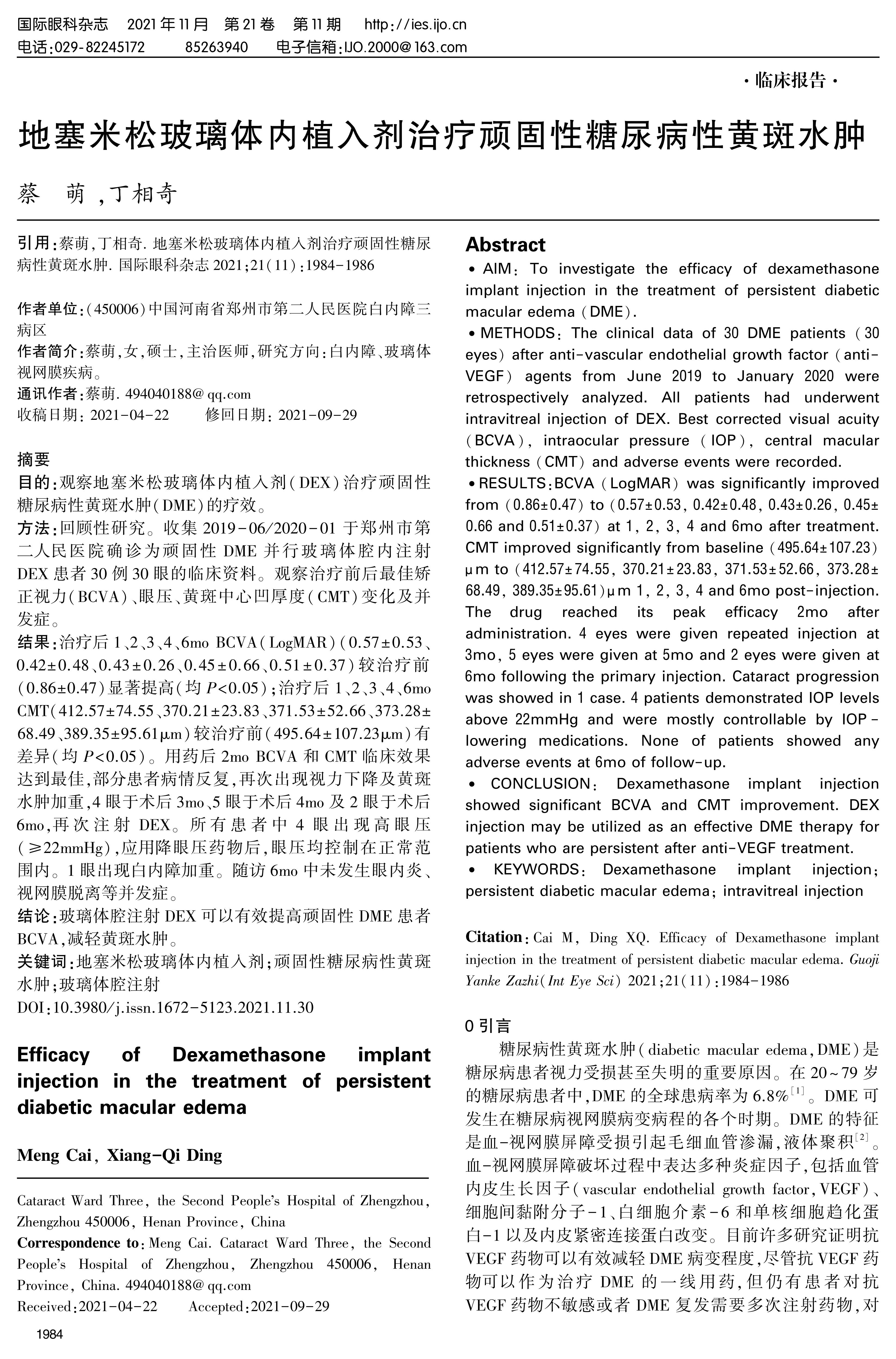 AIM: To investigate the efficacy of dexamethasone implant injection in the treatment of persistent diabetic macular edema(DME).METHODS: The clinical data of 30 DME patients(30 eyes)after anti-vascular endothelial growth factor(anti-VEGF)agents from June 2019 to January 2020 were retrospectively analyzed. All patients had underwent intravitreal injection of DEX. Best corrected visual acuity(BCVA), intraocular pressure(IOP), central macular thickness(CMT)and adverse events were recorded.RESULTS:BCVA(LogMAR)was significantly improved from(0.86±0.47)to(0.57±0.53, 0.42±0.48, 0.43±0.26, 0.45±0.66 and 0.51±0.37)at 1, 2, 3, 4 and 6mo after treatment. CMT improved significantly from baseline(495.64±107.23)μm to(412.57±74.55, 370.21±23.83, 371.53±52.66, 373.28±68.49, 389.35±95.61)μm 1, 2, 3, 4 and 6mo post-injection. The drug reached its peak efficacy 2mo after administration. 4 eyes were given repeated injection at 3mo, 5 eyes were given at 5mo and 2 eyes were given at 6mo following the primary injection. Cataract progression was showed in 1 case. 4 patients demonstrated IOP levels above 22mmHg and were mostly controllable by IOP-lowering medications. None of patients showed any adverse events at 6mo of follow-up.CONCLUSION: Dexamethasone implant injection showed significant BCVA and CMT improvement. DEX injection may be utilized as an effective DME therapy for patients who are persistent after anti-VEGF treatment.