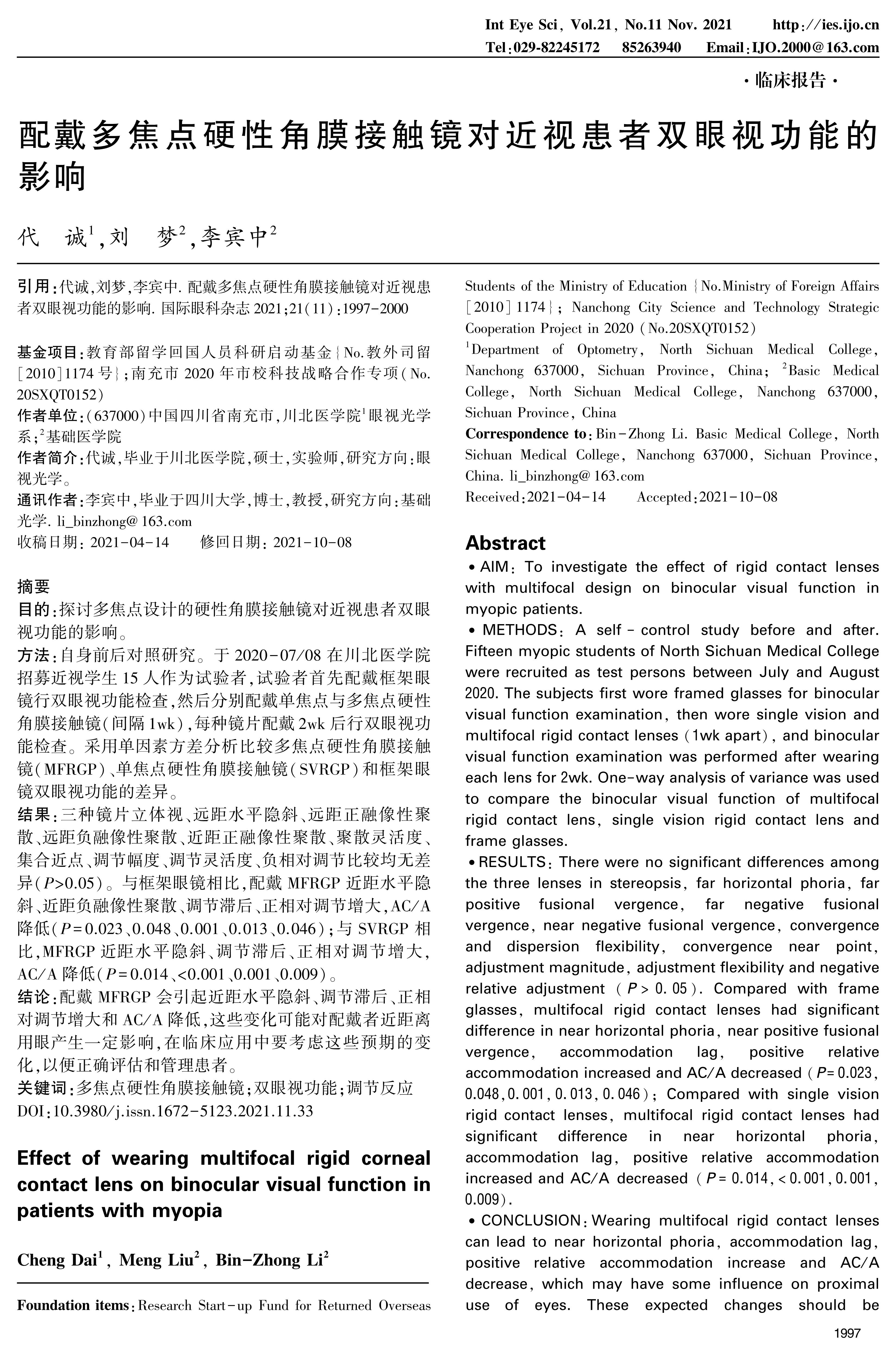 目的:探讨多焦点设计的硬性角膜接触镜对近视患者双眼视功能的影响。方法:自身前后对照研究。于2020-07/08在川北医学院招募近视学生15人作为试验者,试验者首先配戴框架眼镜行双眼视功能检查,然后分别配戴单焦点与多焦点硬性角膜接触镜(间隔1wk),每种镜片配戴2wk后行双眼视功能检查。采用单因素方差分析比较多焦点硬性角膜接触镜(MFRGP)、单焦点硬性角膜接触镜(SVRGP)和框架眼镜双眼视功能的差异。结果:三种镜片立体视、远距水平隐斜、远距正融像性聚散、远距负融像性聚散、近距正融像性聚散、聚散灵活度、集合近点、调节幅度、调节灵活度、负相对调节比较均无差异(P>0.05)。与框架眼镜相比,配戴MFRGP近距水平隐斜、近距负融像性聚散、调节滞后、正相对调节增大,AC/A降低(P=0.023、0.048、0.001、0.013、0.046); 与SVRGP相比,MFRGP近距水平隐斜、调节滞后、正相对调节增大,AC/A降低(P=0.014、<0.001、0.001、0.009)。结论:配戴MFRGP会引起近距水平隐斜、调节滞后、正相对调节增大和AC/A降低,这些变化可能对配戴者近距离用眼产生一定影响,在临床应用中要考虑这些预期的变化,以便正确评估和管理患者。