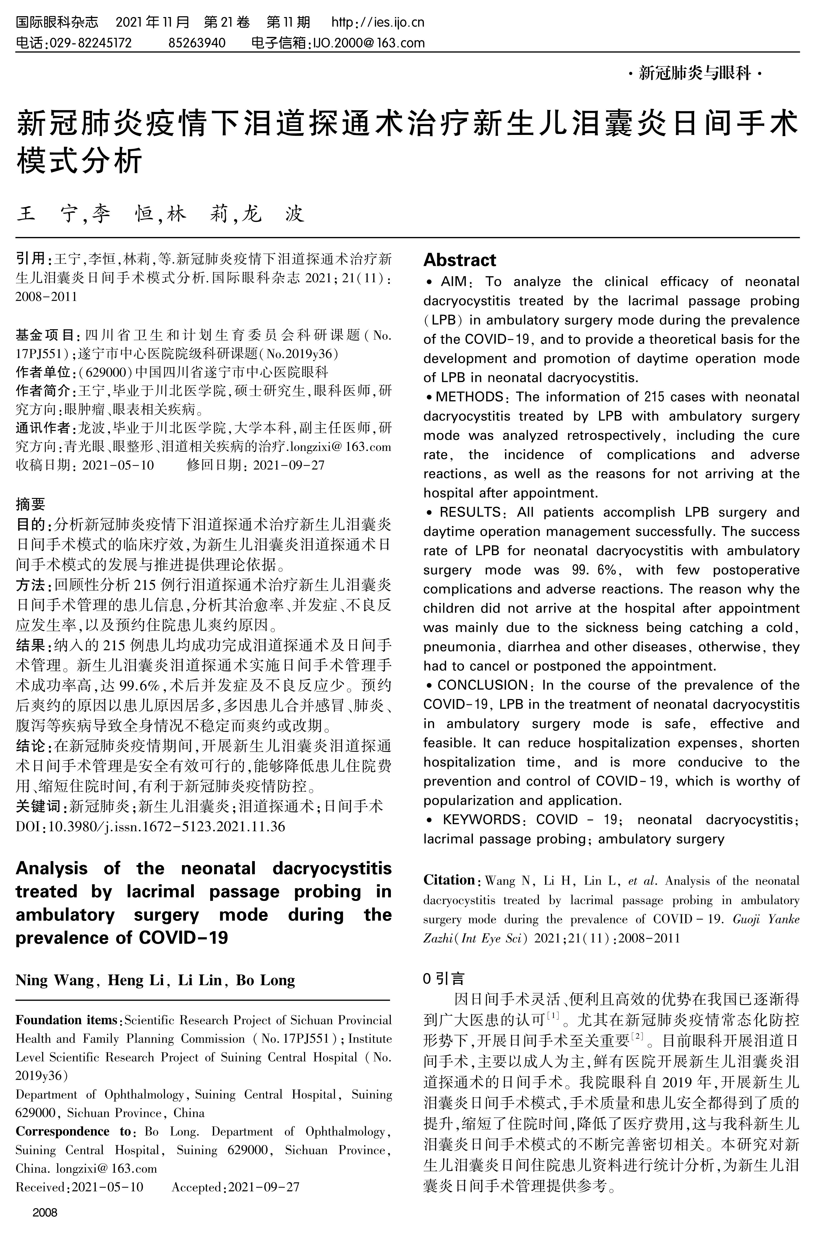 AIM: To analyze the clinical efficacy of neonatal dacryocystitis treated by the lacrimal passage probing(LPB)in ambulatory surgery mode during the prevalence of the COVID-19, and to provide a theoretical basis for the development and promotion of daytime operation mode of LPB in neonatal dacryocystitis.METHODS: The information of 215 cases with neonatal dacryocystitis treated by LPB with ambulatory surgery mode was analyzed retrospectively, including the cure rate, the incidence of complications and adverse reactions, as well as the reasons for not arriving at the hospital after appointment.RESULTS: All patients accomplish LPB surgery and daytime operation management successfully. The success rate of LPB for neonatal dacryocystitis with ambulatory surgery mode was 99.6%, with few postoperative complications and adverse reactions. The reason why the children did not arrive at the hospital after appointment was mainly due to the sickness being catching a cold, pneumonia, diarrhea and other diseases, otherwise, they had to cancel or postponed the appointment.CONCLUSION: In the course of the prevalence of the COVID-19, LPB in the treatment of neonatal dacryocystitis in ambulatory surgery mode is safe, effective and feasible. It can reduce hospitalization expenses, shorten hospitalization time, and is more conducive to the prevention and control of COVID-19, which is worthy of popularization and application.