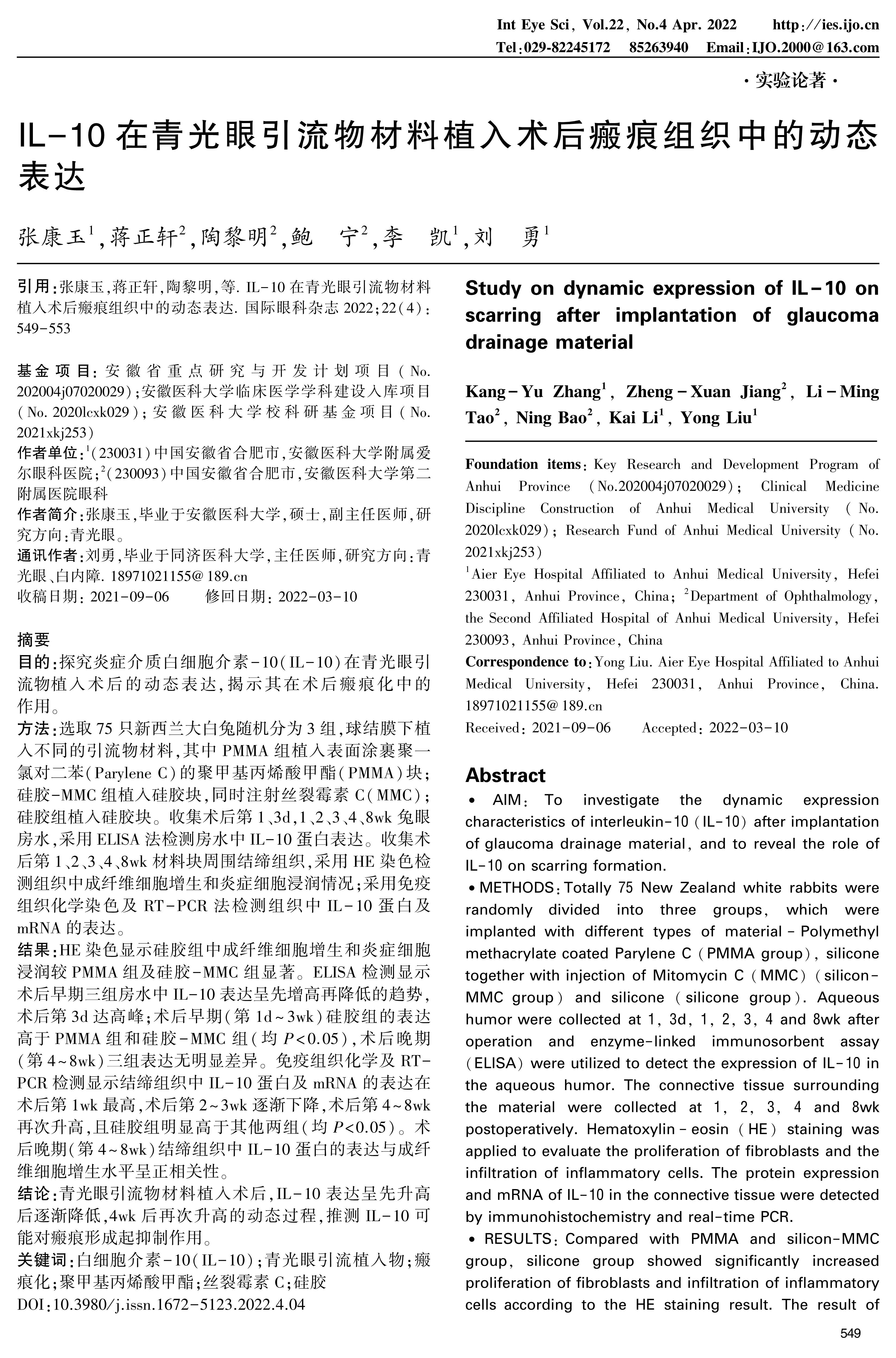 结果:HE染色显示硅胶组中成纤维细胞增生和炎症细胞浸润较PMMA组及硅胶-MMC组显著。ELISA检测显示术后早期三组房水中IL-10表达呈先增高再降低的趋势,术后第3d达高峰; 术后早期(第1d~3wk)硅胶组的表达高于PMMA组和硅胶-MMC组(均P<0.05),术后晚期(第4~8wk)三组表达无明显差异。免疫组织化学及RT-PCR检测显示结缔组织中IL-10蛋白及mRNA的表达在术后第1wk最高,术后第2~3wk逐渐下降,术后第4~8wk再次升高,且硅胶组明显高于其他两组(均P<0.05)。术后晚期(第4~8wk)结缔组织中IL-10蛋白的表达与成纤维细胞增生水平呈正相关性。