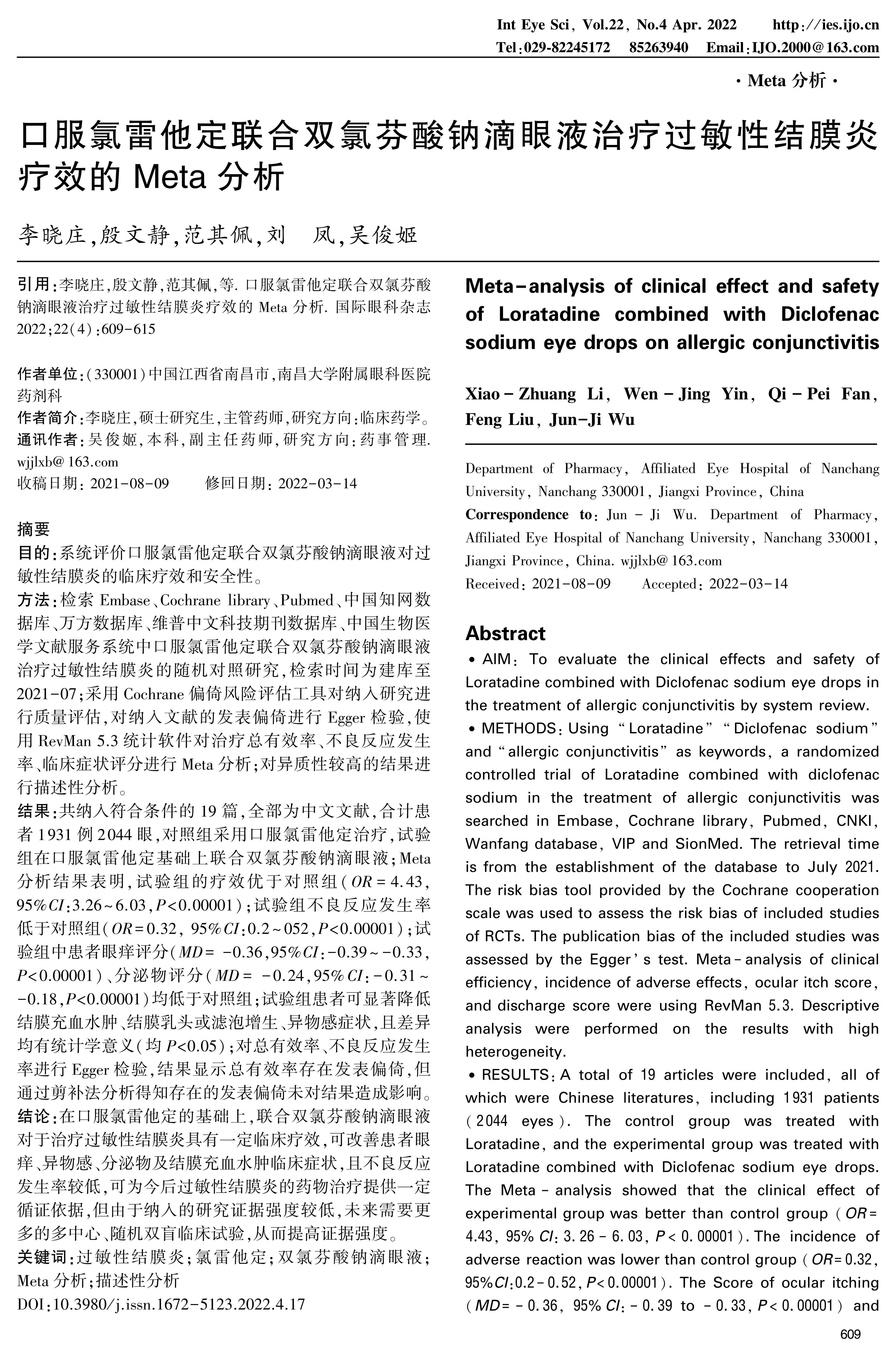 RESULTS:A total of 19 articles were included, all of which were Chinese literatures, including 1 931 patients(2 044 eyes). The control group was treated with Loratadine, and the experimental group was treated with Loratadine combined with Diclofenac sodium eye drops. The Meta-analysis showed that the clinical effect of experimental group was better than control group(OR=4.43, 95%CI:3.26-6.03,P<0.00001).The incidence of adverse reaction was lower than control group(OR=0.32, 95%CI:0.2-0.52,P<0.00001). The Score of ocular itching(MD=-0.36, 95%CI:-0.39 to -0.33,P<0.00001)and discharge(MD=-0.24,95%CI: -0.31 to -0.18,P<0.00001)in experimental group was lower than control group. All the studies on hyperemia and edema of conjunctiva, conjunctival papilla or follicle proliferation and foreign body sensation in patients with allergic conjunctivitis showed that the experimental group could significantly reduce the above symptoms(all P<0.05). Egger's test was performed on the total effective rate, the incidence of adverse reaction. The results showed that there was publication bias in the total effective. Trim and fill method showed that the publication bias did not affect the results.