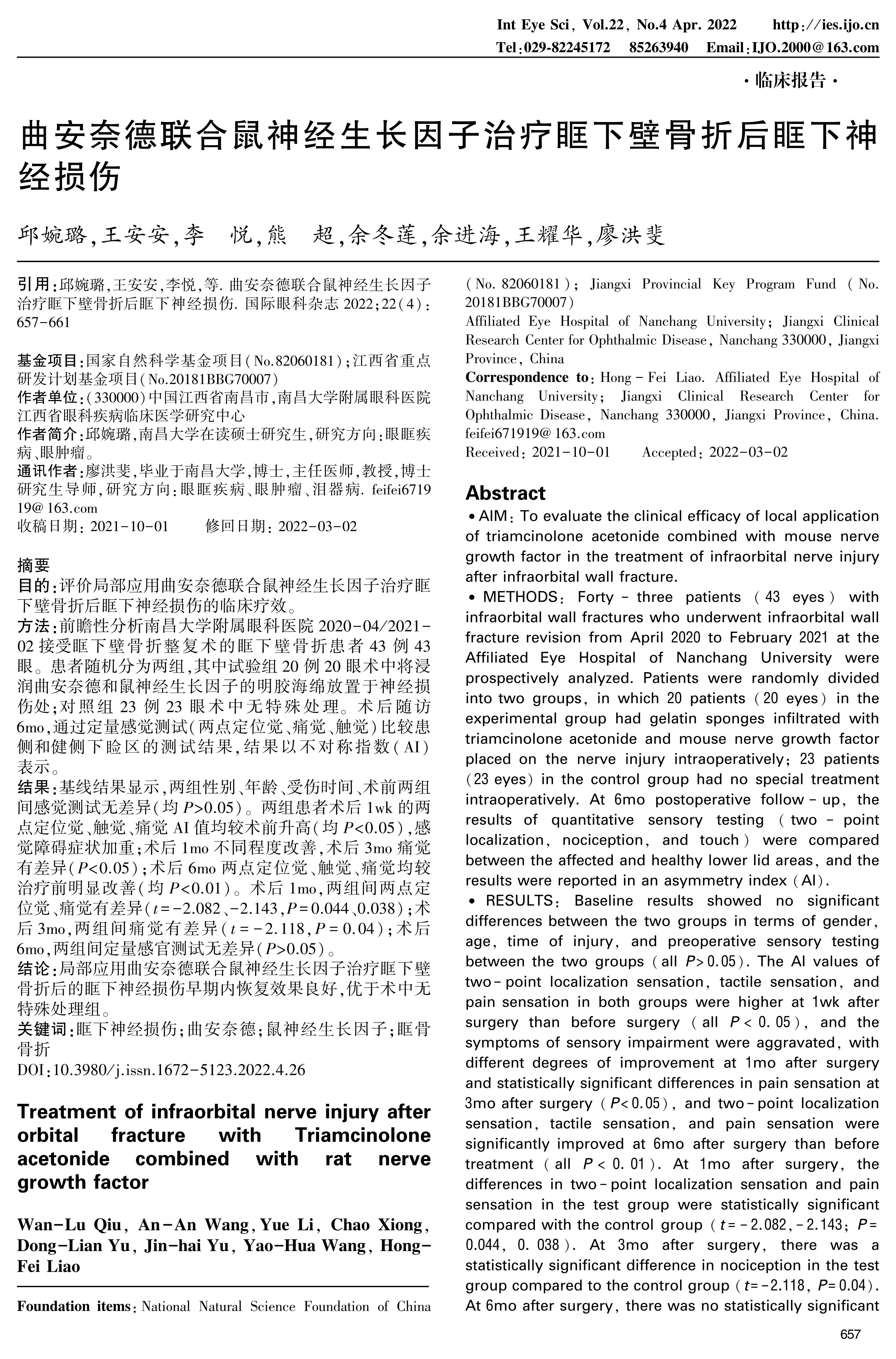 CONCLUSION: Local application of triamcinolone acetonide combined with mouse nerve growth factor for the treatment of infraorbital nerve injury after infraorbital wall fracture was effective in early internal recovery and superior to the group without special intraoperative treatment.