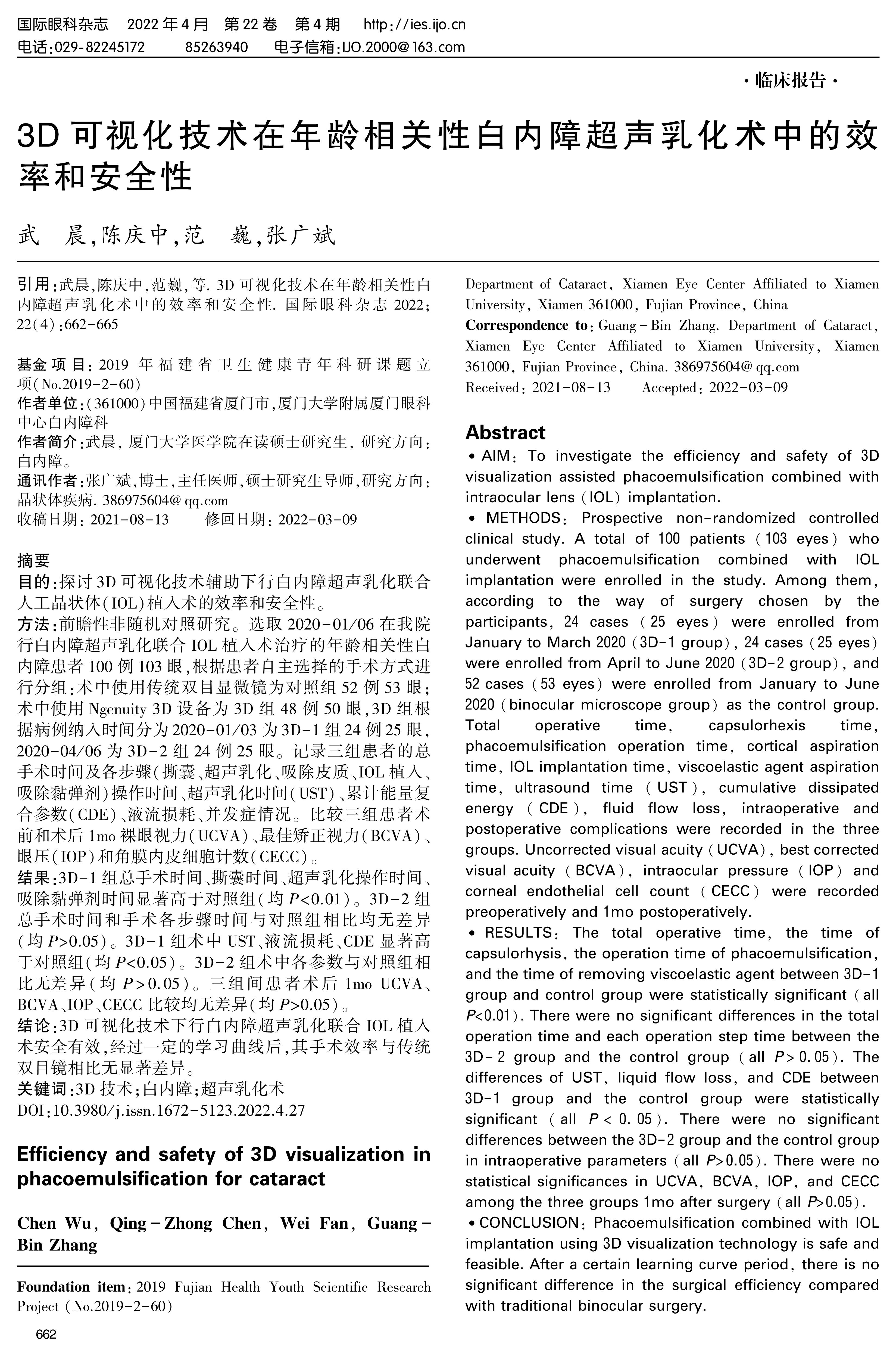 CONCLUSION: Phacoemulsification combined with IOL implantation using 3D visualization technology is safe and feasible. After a certain learning curve period, there is no significant difference in the surgical efficiency compared with traditional binocular surgery.