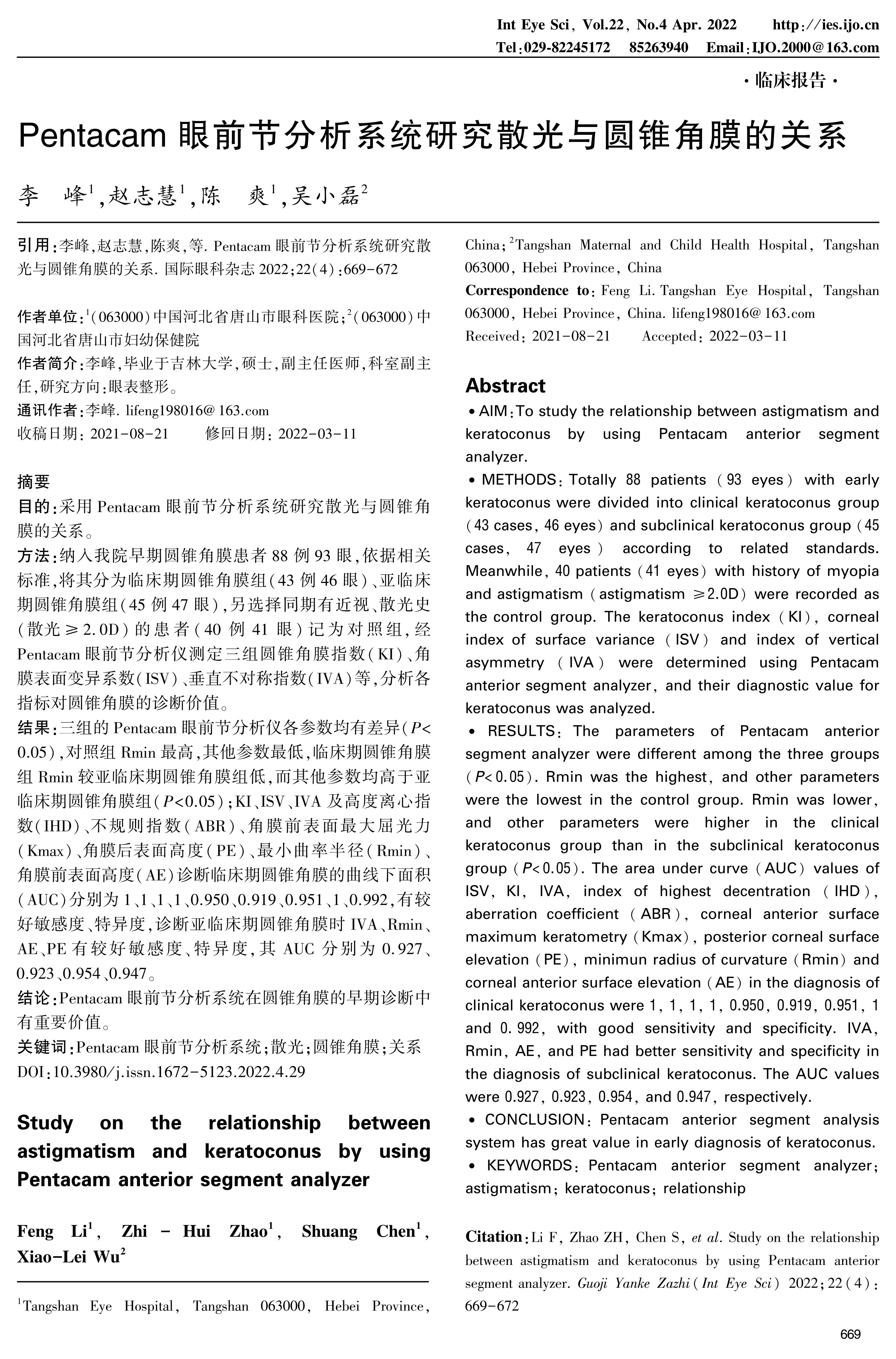 结论:Pentacam眼前节分析系统在圆锥角膜的早期诊断中有重要价值。