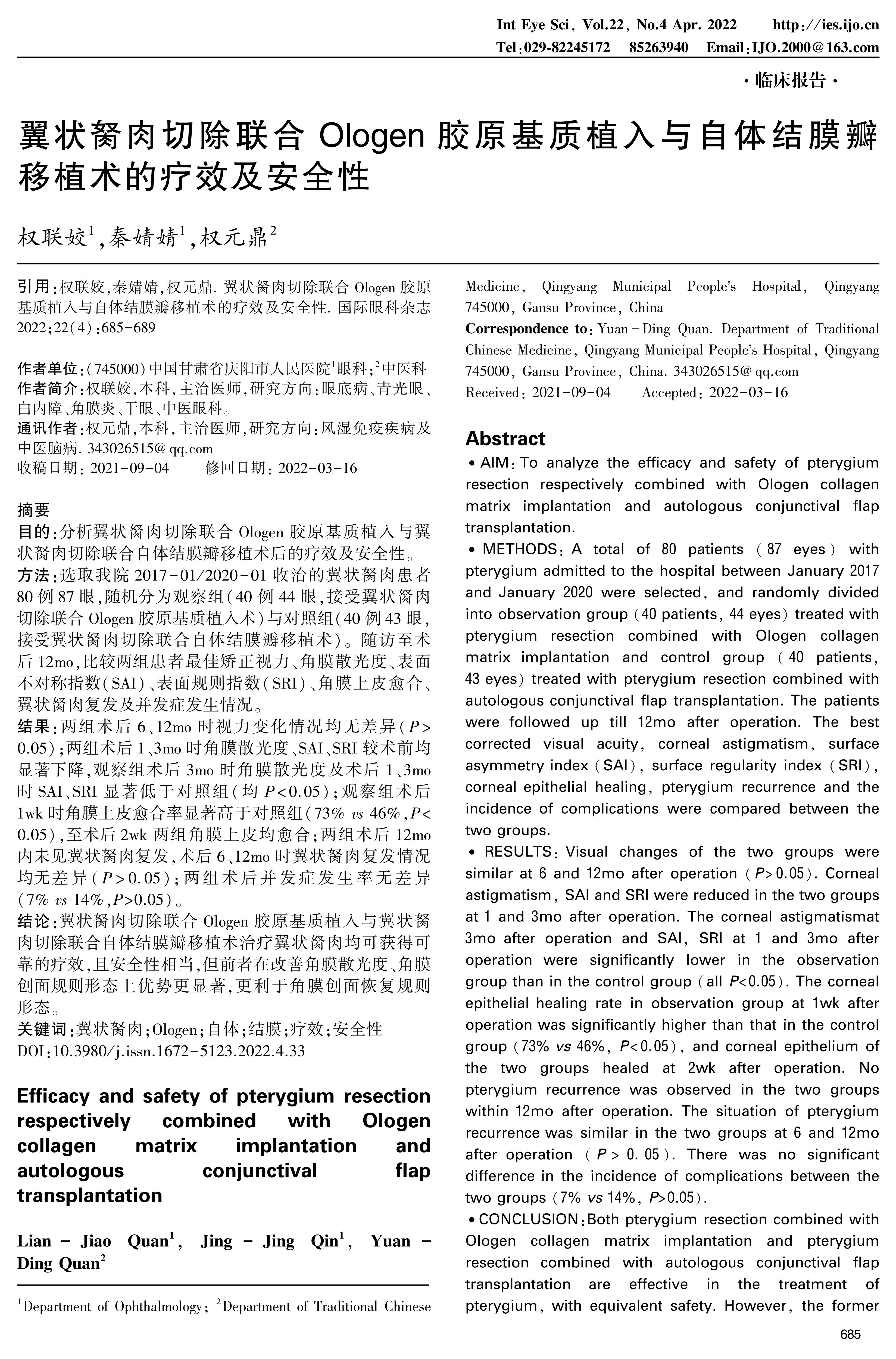 结果:两组术后6、12mo时视力变化情况均无差异(P>0.05); 两组术后1、3mo时角膜散光度、SAI、SRI较术前均显著下降,观察组术后3mo时角膜散光度及术后1、3mo时SAI、SRI显著低于对照组(均P<0.05); 观察组术后1wk时角膜上皮愈合率显著高于对照组(73% vs 46%,P<0.05),至术后2wk两组角膜上皮均愈合; 两组术后12mo内未见翼状胬肉复发,术后6、12mo时翼状胬肉复发情况均无差异(P>0.05); 两组术后并发症发生率无差异(7% vs 14%,P>0.05)。