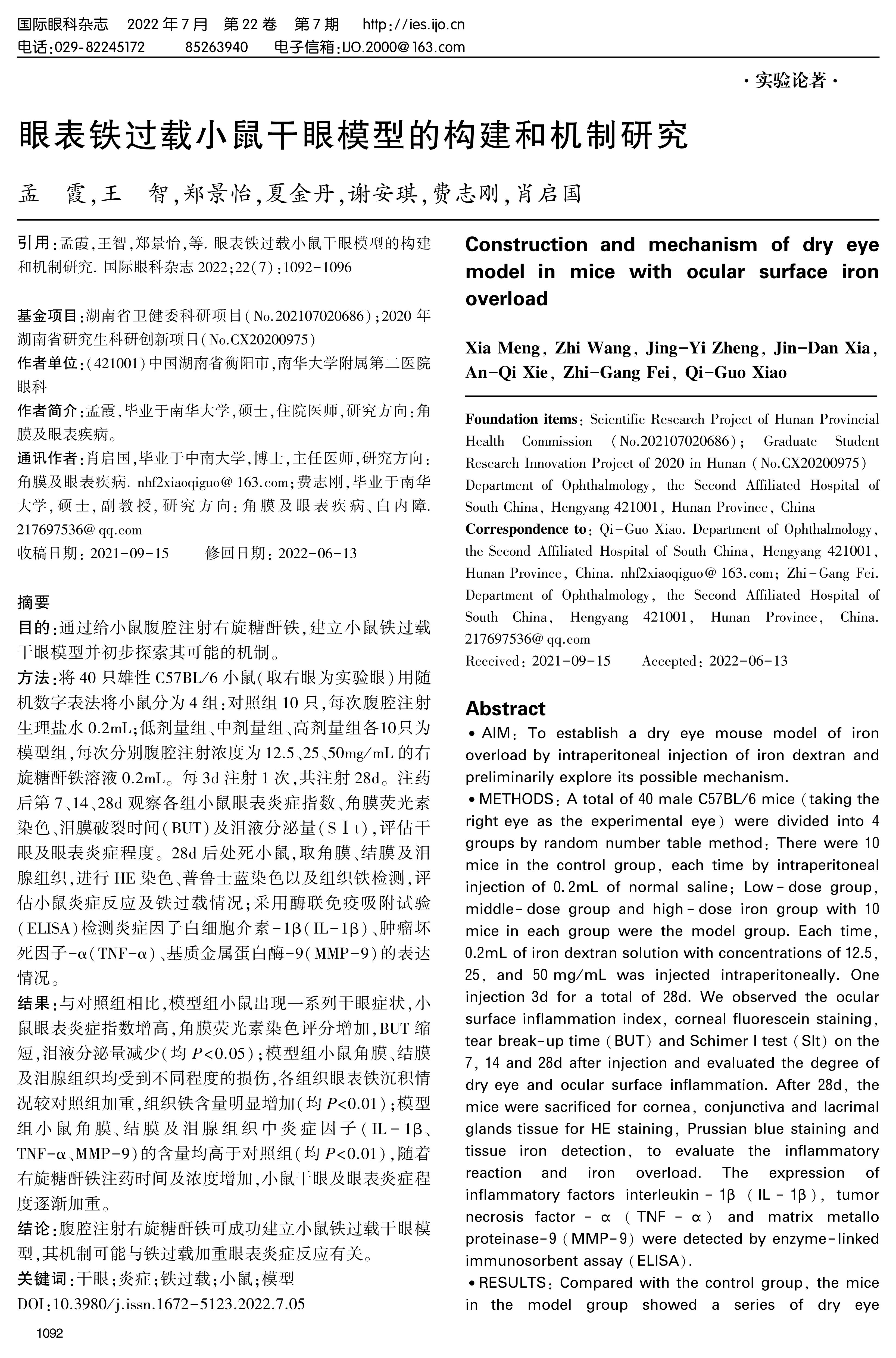 结论:腹腔注射右旋糖酐铁可成功建立小鼠铁过载干眼模型,其机制可能与铁过载加重眼表炎症反应有关。