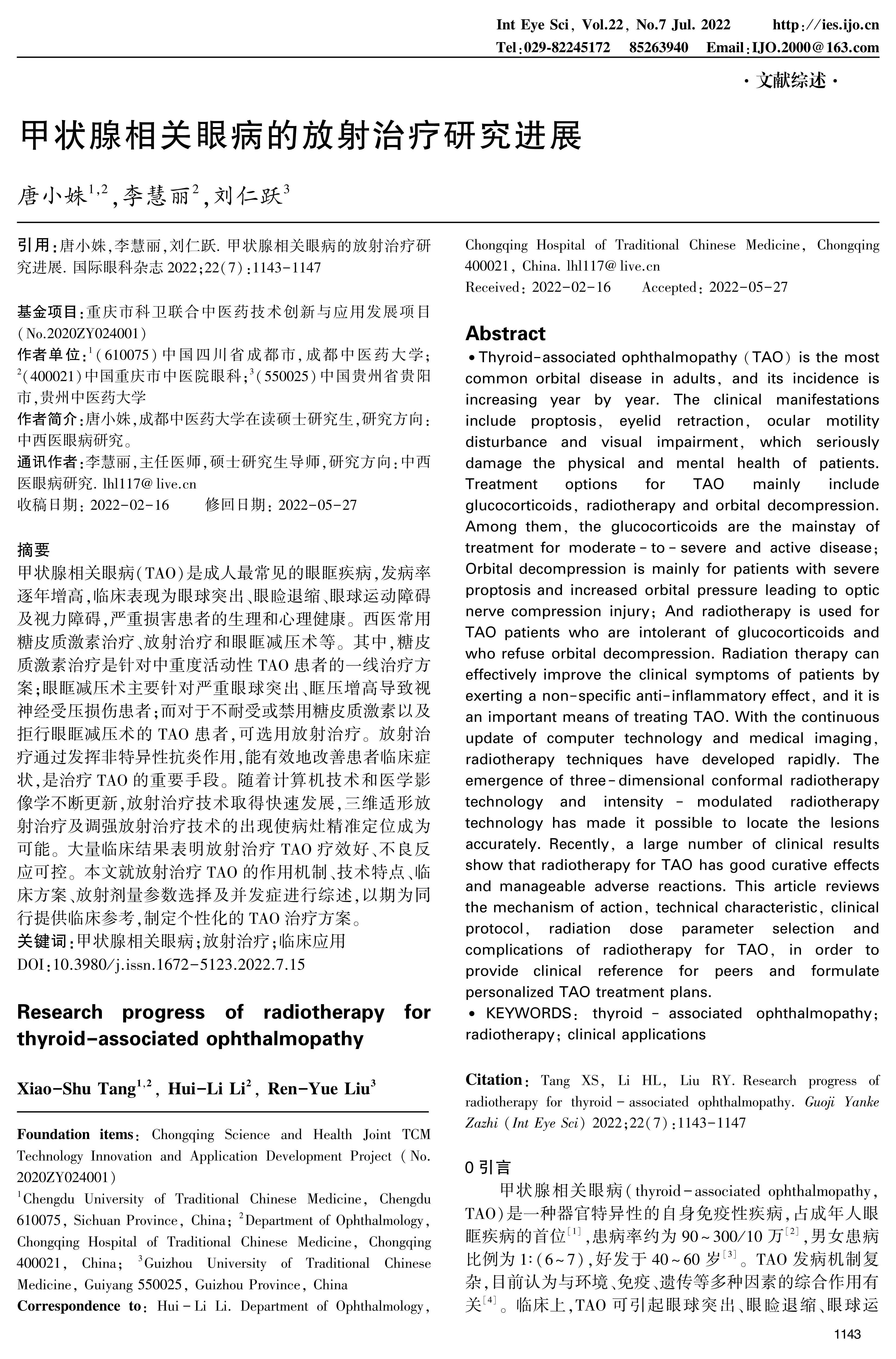Thyroid-associated ophthalmopathy(TAO)is the most common orbital disease in adults, and its incidence is increasing year by year. The clinical manifestations include proptosis, eyelid retraction, ocular motility disturbance and visual impairment, which seriously damage the physical and mental health of patients. Treatment options for TAO mainly include glucocorticoids, radiotherapy and orbital decompression. Among them, the glucocorticoids are the mainstay of treatment for moderate-to-severe and active disease; Orbital decompression is mainly for patients with severe proptosis and increased orbital pressure leading to optic nerve compression injury; And radiotherapy is used for TAO patients who are intolerant of glucocorticoids and who refuse orbital decompression. Radiation therapy can effectively improve the clinical symptoms of patients by exerting a non-specific anti-inflammatory effect, and it is an important means of treating TAO. With the continuous update of computer technology and medical imaging, radiotherapy techniques have developed rapidly. The emergence of three-dimensional conformal radiotherapy technology and intensity-modulated radiotherapy technology has made it possible to locate the lesions accurately. Recently, a large number of clinical results show that radiotherapy for TAO has good curative effects and manageable adverse reactions. This article reviews the mechanism of action, technical characteristic, clinical protocol, radiation dose parameter selection and complications of radiotherapy for TAO, in order to provide clinical reference for peers and formulate personalized TAO treatment plans.