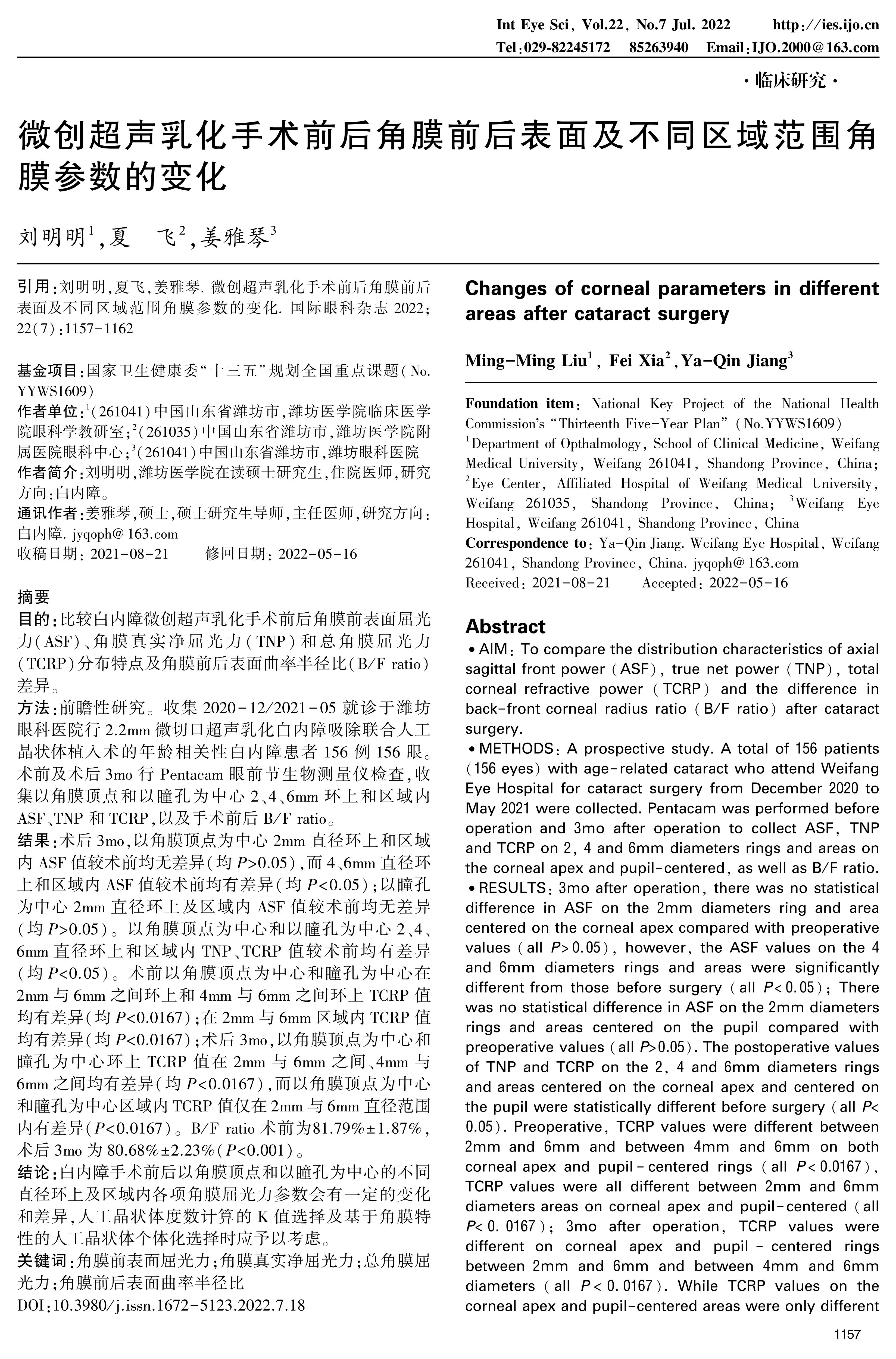 方法:前瞻性研究。收集2020-12/2021-05就诊于潍坊眼科医院行2.2mm微切口超声乳化白内障吸除联合人工晶状体植入术的年龄相关性白内障患者156例156眼。术前及术后3mo行Pentacam眼前节生物测量仪检查,收集以角膜顶点和以瞳孔为中心2、4、6mm环上和区域内ASF、TNP和TCRP,以及手术前后B/F ratio。