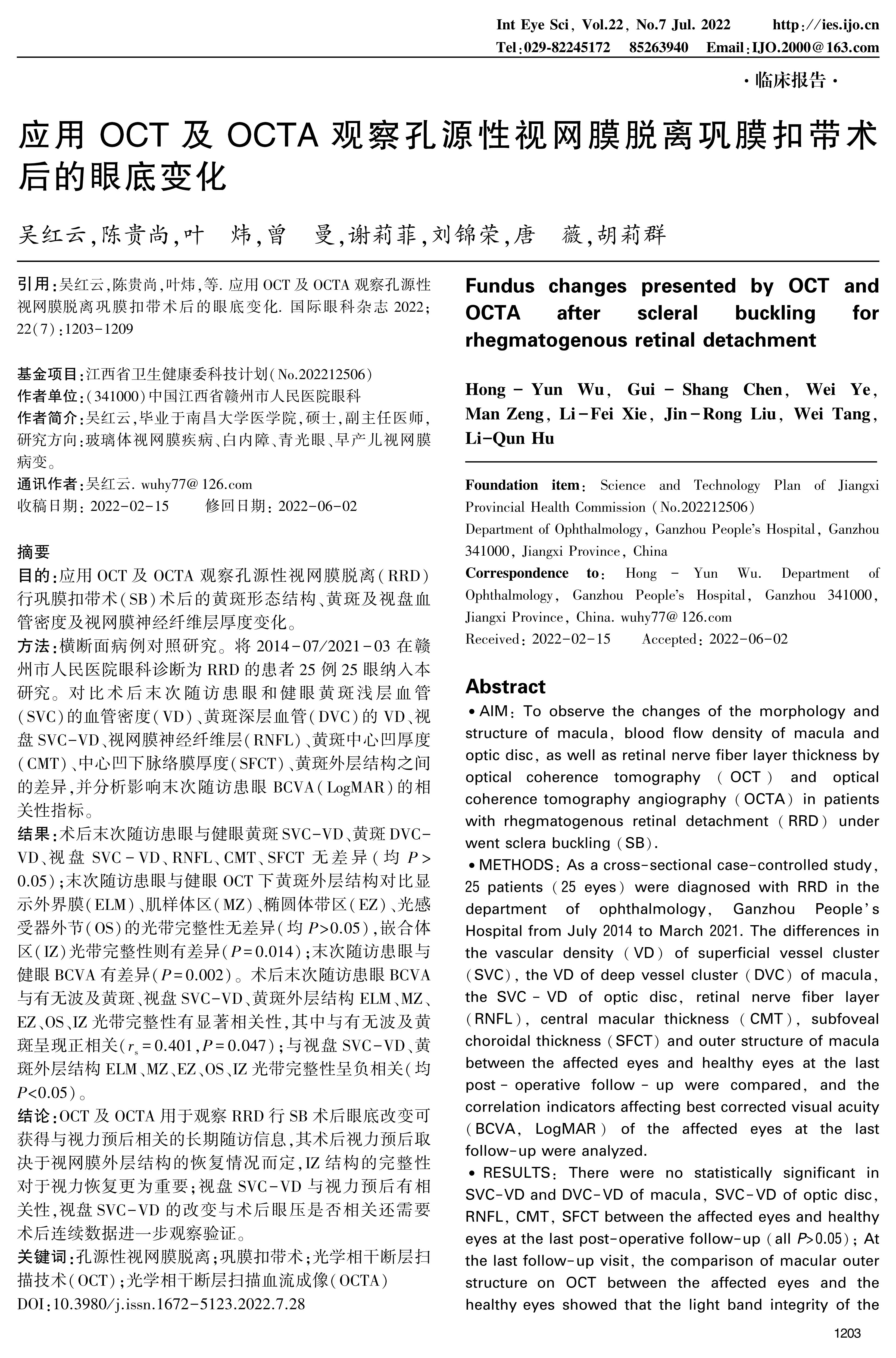 METHODS: As a cross-sectional case-controlled study, 25 patients(25 eyes)were diagnosed with RRD in the department of ophthalmology, Ganzhou People's Hospital from July 2014 to March 2021. The differences in the vascular density(VD)of superficial vessel cluster(SVC), the VD of deep vessel cluster(DVC)of macula, the SVC-VD of optic disc, retinal nerve fiber layer(RNFL), central macular thickness(CMT), subfoveal choroidal thickness(SFCT)and outer structure of macula between the affected eyes and healthy eyes at the last post-operative follow-up were compared, and the correlation indicators affecting best corrected visual acuity(BCVA, LogMAR)of the affected eyes at the last follow-up were analyzed.