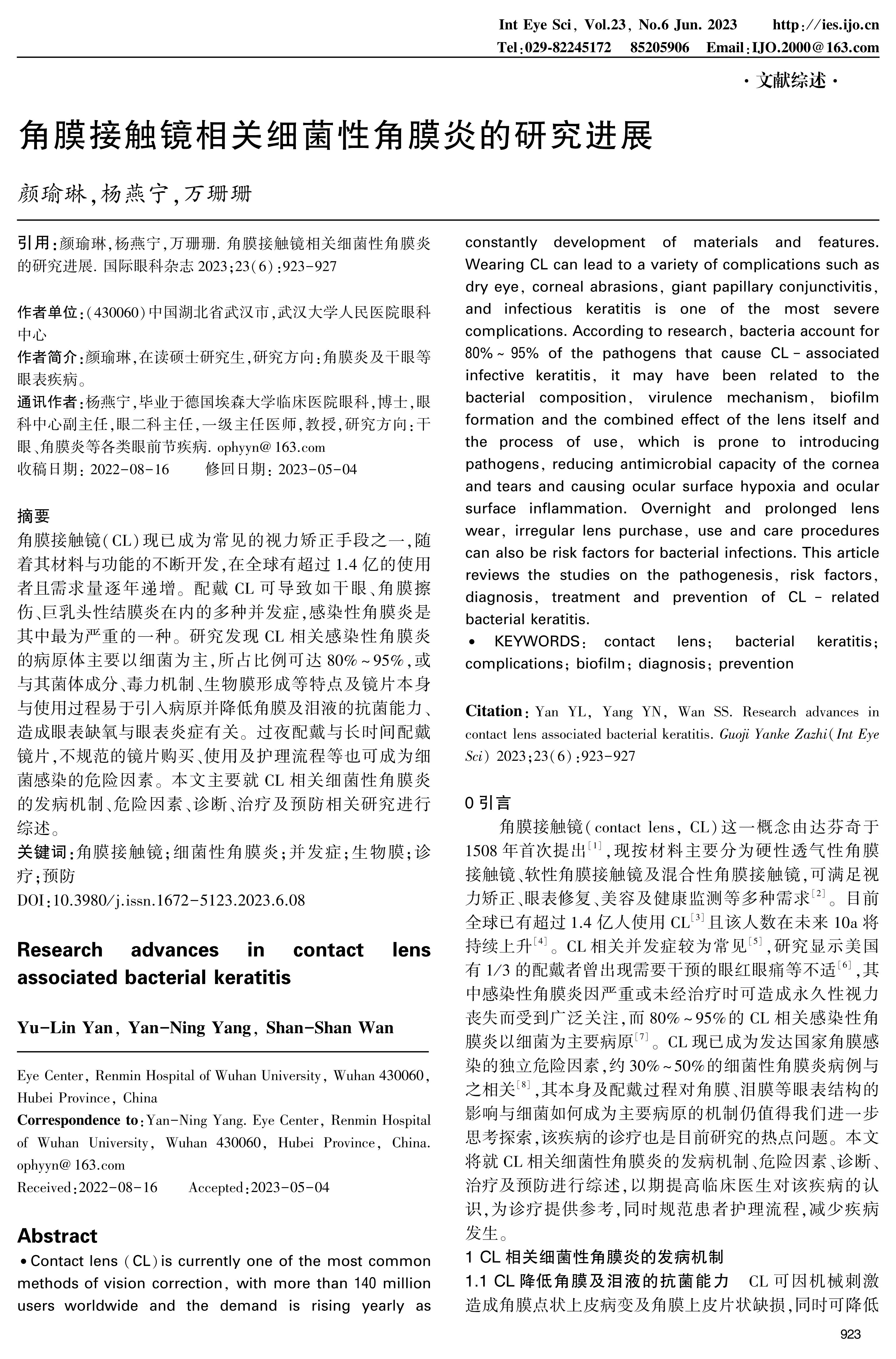 角膜接触镜(CL)现已成为常见的视力矫正手段之一,随着其材料与功能的不断开发,在全球有超过1.4亿的使用者且需求量逐年递增。配戴CL可导致如干眼、角膜擦伤、巨乳头性结膜炎在内的多种并发症,感染性角膜炎是其中最为严重的一种。研究发现CL相关感染性角膜炎的病原体主要以细菌为主,所占比例可达80%~95%,或与其菌体成分、毒力机制、生物膜形成等特点及镜片本身与使用过程易于引入病原并降低角膜及泪液的抗菌能力、造成眼表缺氧与眼表炎症有关。过夜配戴与长时间配戴镜片,不规范的镜片购买、使用及护理流程等也可成为细菌感染的危险因素。本文主要就CL相关细菌性角膜炎的发病机制、危险因素、诊断、治疗及预防相关研究进行综述。