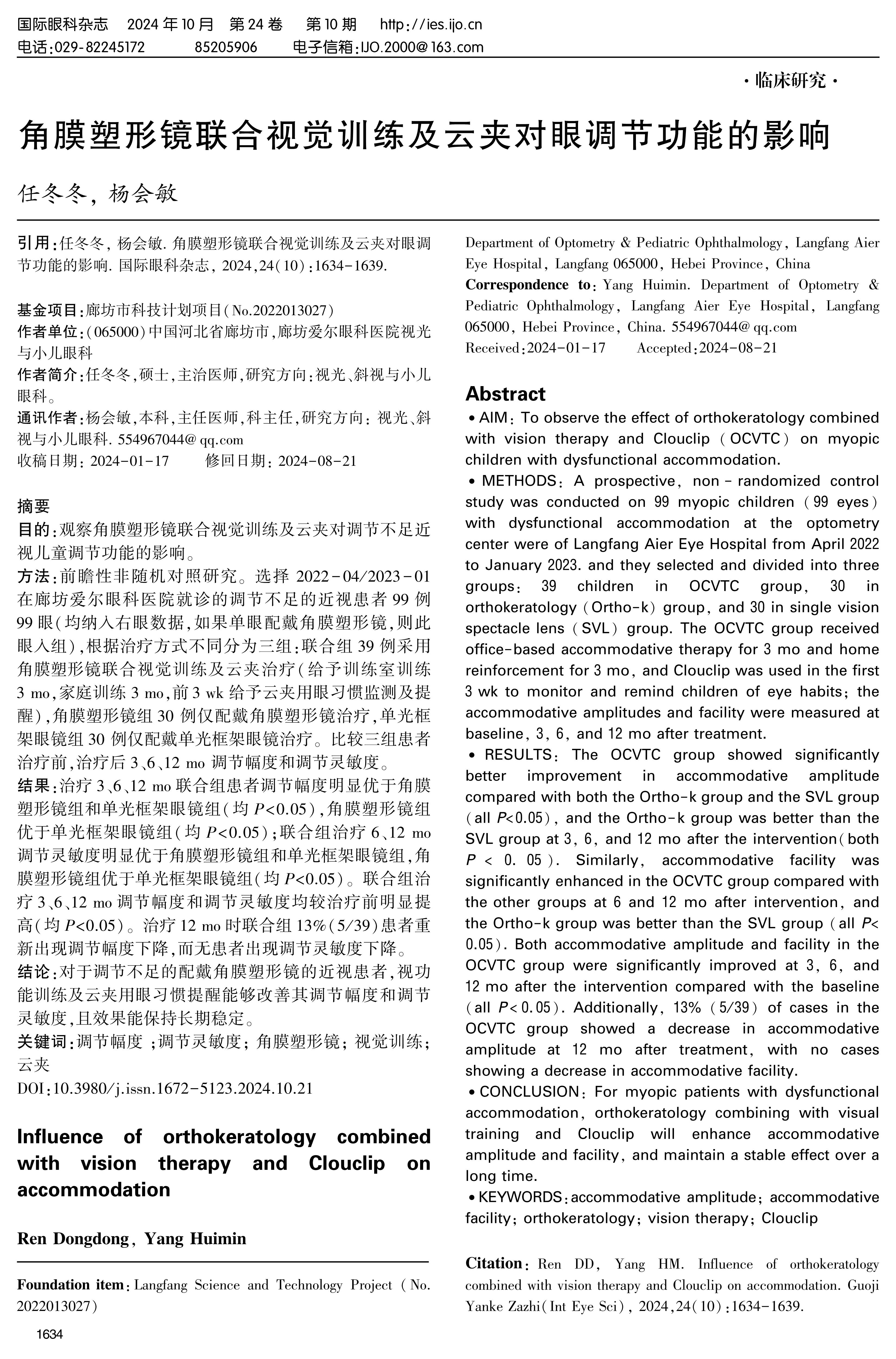 CONCLUSION: For myopic patients with dysfunctional accommodation, orthokeratology combining with visual training and Clouclip will enhance accommodative amplitude and facility, and maintain a stable effect over a long time.