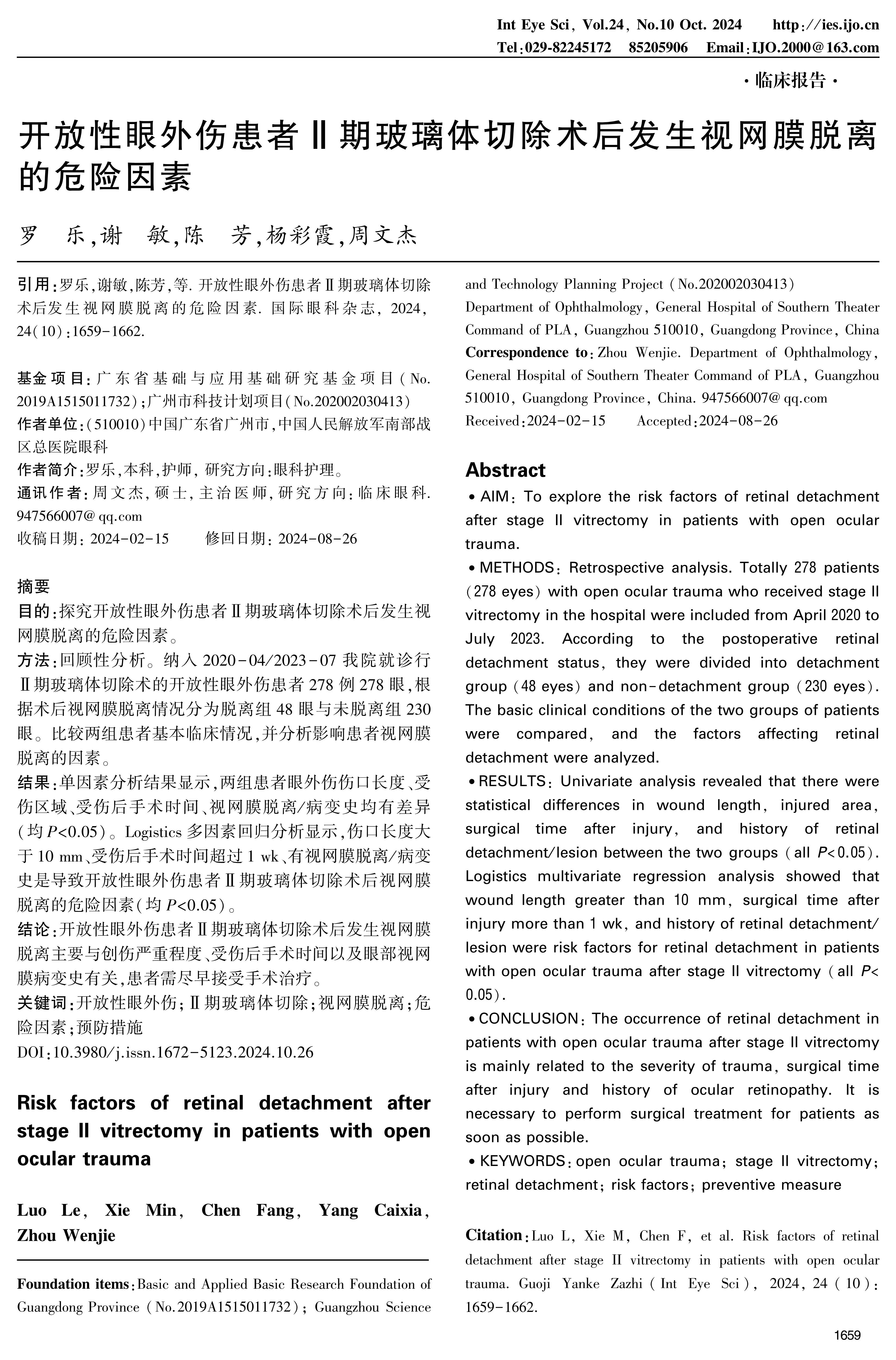 RESULTS: Univariate analysis revealed that there were statistical differences in wound length, injured area, surgical time after injury, and history of retinal detachment/lesion between the two groups(all P<0.05). Logistics multivariate regression analysis showed that wound length greater than 10 mm, surgical time after injury more than 1 wk, and history of retinal detachment/lesion were risk factors for retinal detachment in patients with open ocular trauma after stage II vitrectomy(all P<0.05).