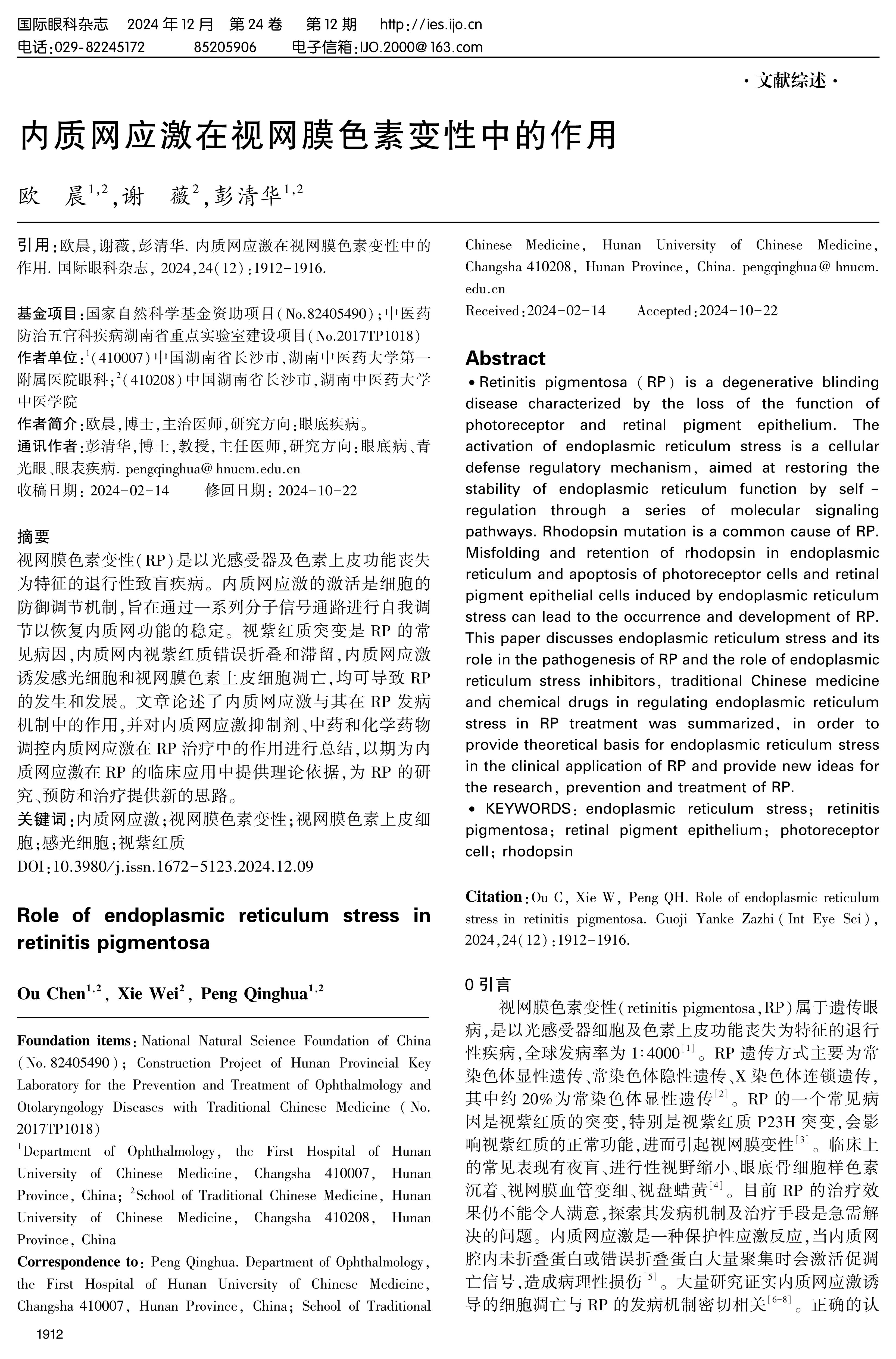 Retinitis pigmentosa(RP)is a degenerative blinding disease characterized by the loss of the function of photoreceptor and retinal pigment epithelium. The activation of endoplasmic reticulum stress is a cellular defense regulatory mechanism, aimed at restoring the stability of endoplasmic reticulum function by self-regulation through a series of molecular signaling pathways. Rhodopsin mutation is a common cause of RP. Misfolding and retention of rhodopsin in endoplasmic reticulum and apoptosis of photoreceptor cells and retinal pigment epithelial cells induced by endoplasmic reticulum stress can lead to the occurrence and development of RP. This paper discusses endoplasmic reticulum stress and its role in the pathogenesis of RP and the role of endoplasmic reticulum stress inhibitors, traditional Chinese medicine and chemical drugs in regulating endoplasmic reticulum stress in RP treatment was summarized, in order to provide theoretical basis for endoplasmic reticulum stress in the clinical application of RP and provide new ideas for the research, prevention and treatment of RP.