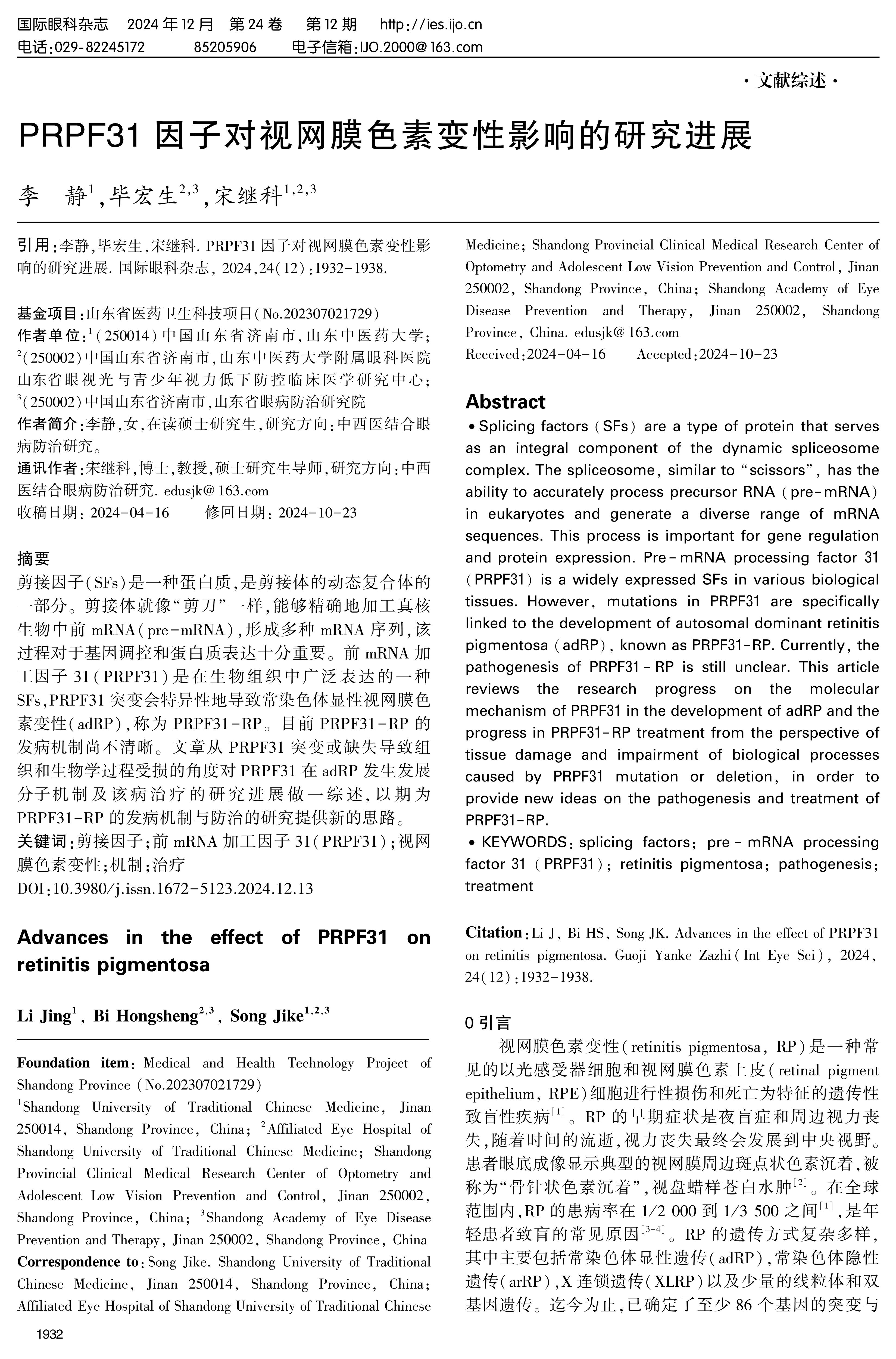 Splicing factors(SFs)are a type of protein that serves as an integral component of the dynamic spliceosome complex. The spliceosome, similar to “scissors”, has the ability to accurately process precursor RNA(pre-mRNA)in eukaryotes and generate a diverse range of mRNA sequences. This process is important for gene regulation and protein expression. Pre-mRNA processing factor 31(PRPF31)is a widely expressed SFs in various biological tissues. However, mutations in PRPF31 are specifically linked to the development of autosomal dominant retinitis pigmentosa(adRP), known as PRPF31-RP. Currently, the pathogenesis of PRPF31-RP is still unclear. This article reviews the research progress on the molecular mechanism of PRPF31 in the development of adRP and the progress in PRPF31-RP treatment from the perspective of tissue damage and impairment of biological processes caused by PRPF31 mutation or deletion, in order to provide new ideas on the pathogenesis and treatment of PRPF31-RP.