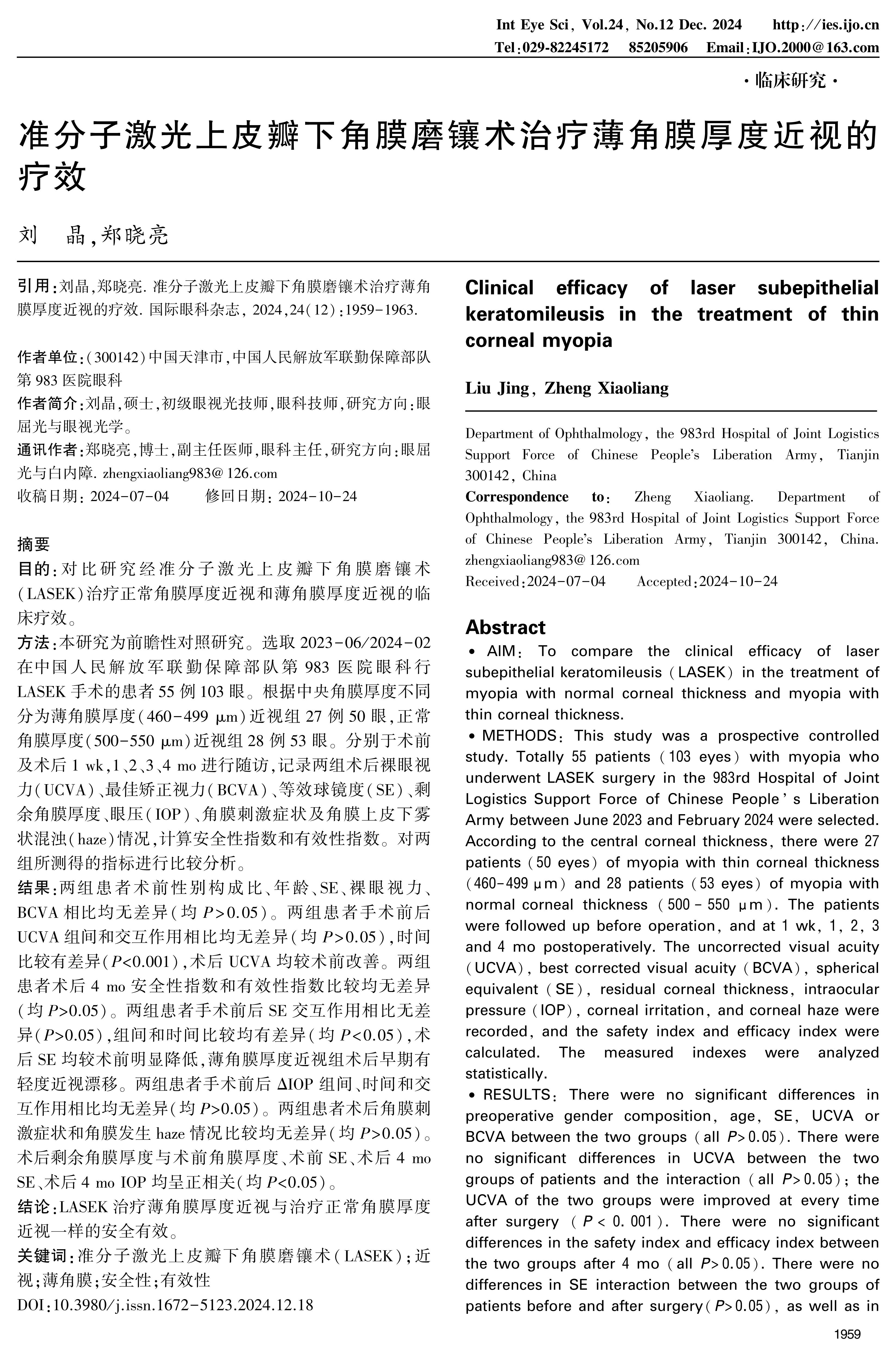 METHODS: This study was a prospective controlled study. Totally 55 patients(103 eyes)with myopia who underwent LASEK surgery in the 983rd Hospital of Joint Logistics Support Force of Chinese People's Liberation Army between June 2023 and February 2024 were selected. According to the central corneal thickness, there were 27 patients(50 eyes)of myopia with thin corneal thickness(460-499 μm)and 28 patients(53 eyes)of myopia with normal corneal thickness(500-550 μm). The patients were followed up before operation, and at 1 wk, 1, 2, 3 and 4 mo postoperatively. The uncorrected visual acuity(UCVA), best corrected visual acuity(BCVA), spherical equivalent(SE), residual corneal thickness, intraocular pressure(IOP), corneal irritation, and corneal haze were recorded, and the safety index and efficacy index were calculated. The measured indexes were analyzed statistically.