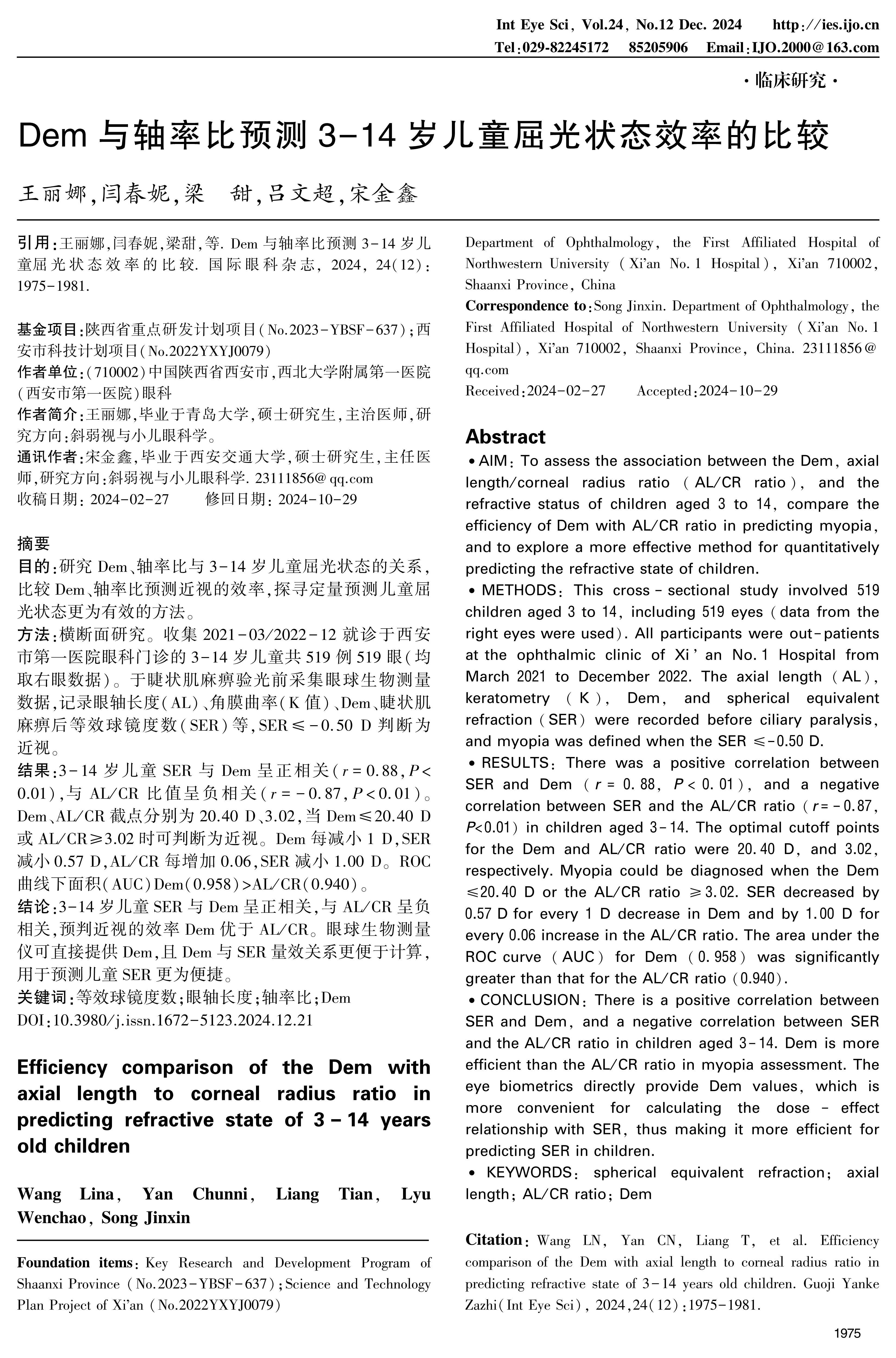 方法:横断面研究。收集2021-03/2022-12就诊于西安市第一医院眼科门诊的3-14岁儿童共519例519眼(均取右眼数据)。于睫状肌麻痹验光前采集眼球生物测量数据,记录眼轴长度(AL)、角膜曲率(K值)、Dem、睫状肌麻痹后等效球镜度数(SER)等,SER≤-0.50 D判断为近视。