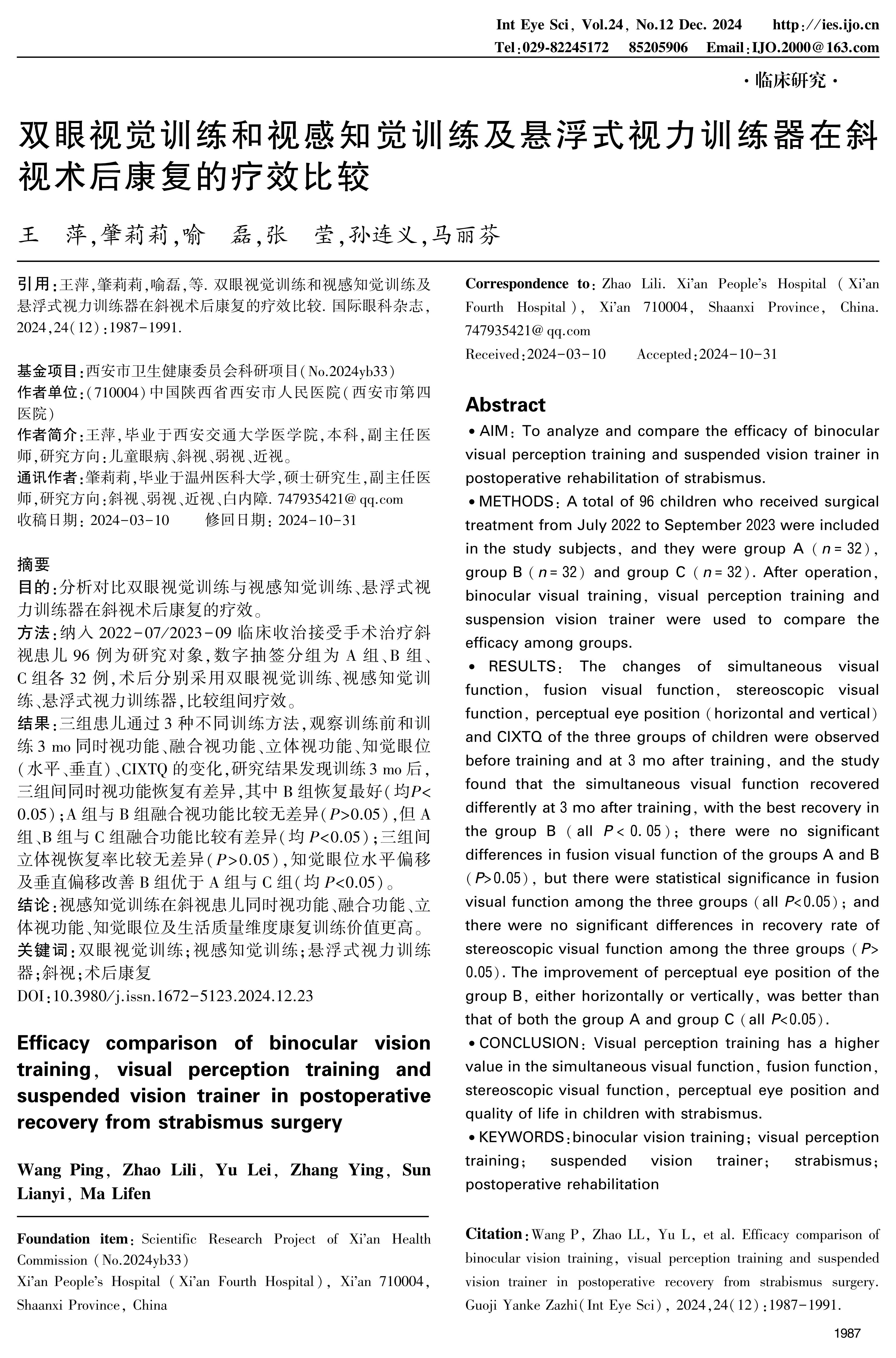 AIM: To analyze and compare the efficacy of binocular visual perception training and suspended vision trainer in postoperative rehabilitation of strabismus.