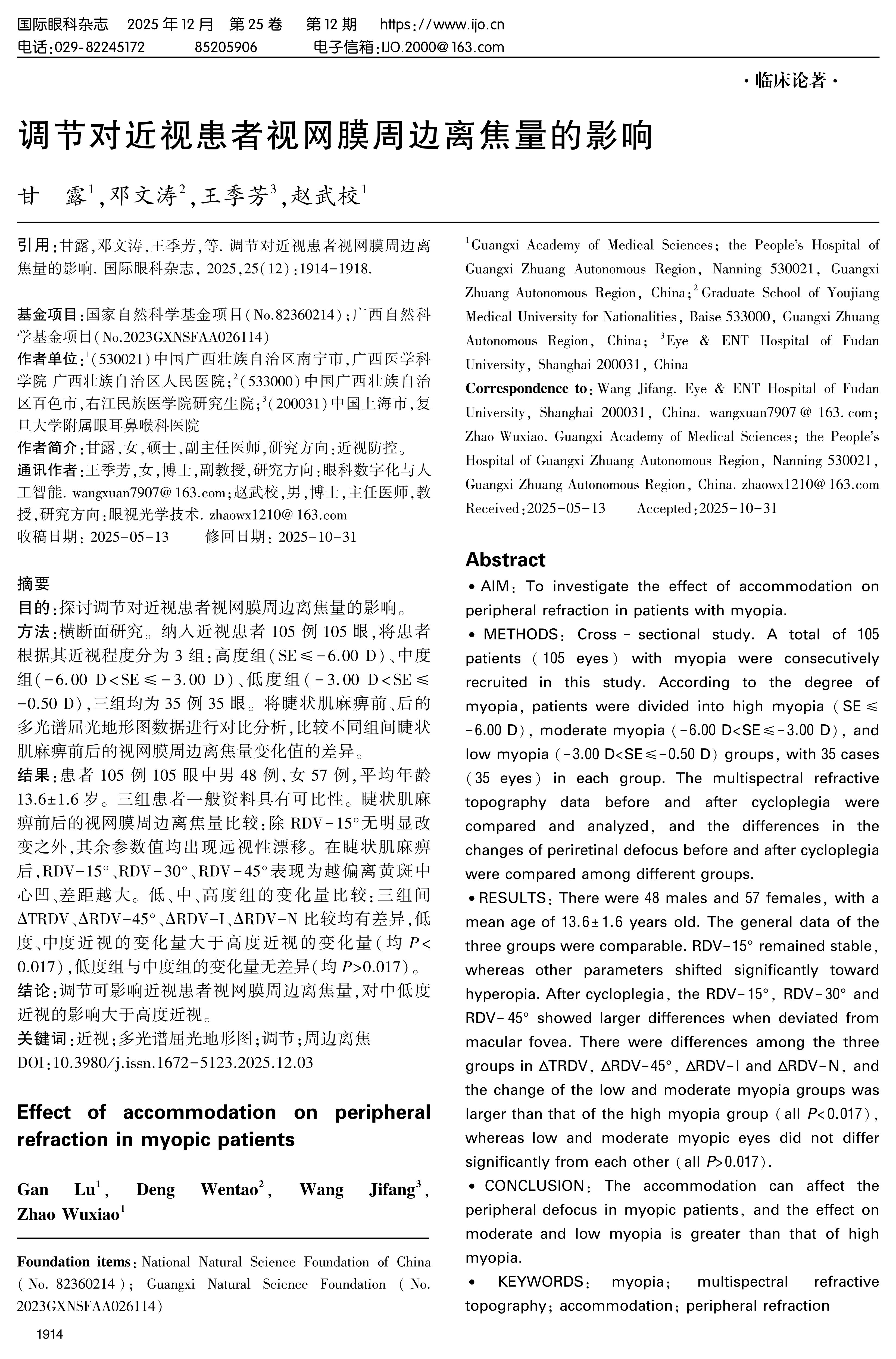 方法:横断面研究。纳入近视患者105例105眼,将患者根据其近视程度分为3组:高度组(SE≤-6.00 D)、中度组(-6.00 D结果:患者105例105眼中男48例,女57例,平均年龄13.6±1.6岁。三组患者一般资料具有可比性。睫状肌麻痹前后的视网膜周边离焦量比较:除RDV-15°无明显改变之外,其余参数值均出现远视性漂移。在睫状肌麻痹后,RDV-15°、RDV-30°、RDV-45°表现为越偏离黄斑中心凹、差距越大。低、中、高度组的变化量比较:三组间ΔTRDV、ΔRDV-45°、ΔRDV-I、ΔRDV-N比较均有差异,低度、中度近视的变化量大于高度近视的变化量(均P<0.017),低度组与中度组的变化量无差异(均P>0.017)。结论:调节可影响近视患者视网膜周边离焦量,对中低度近视的影响大于高度近视。