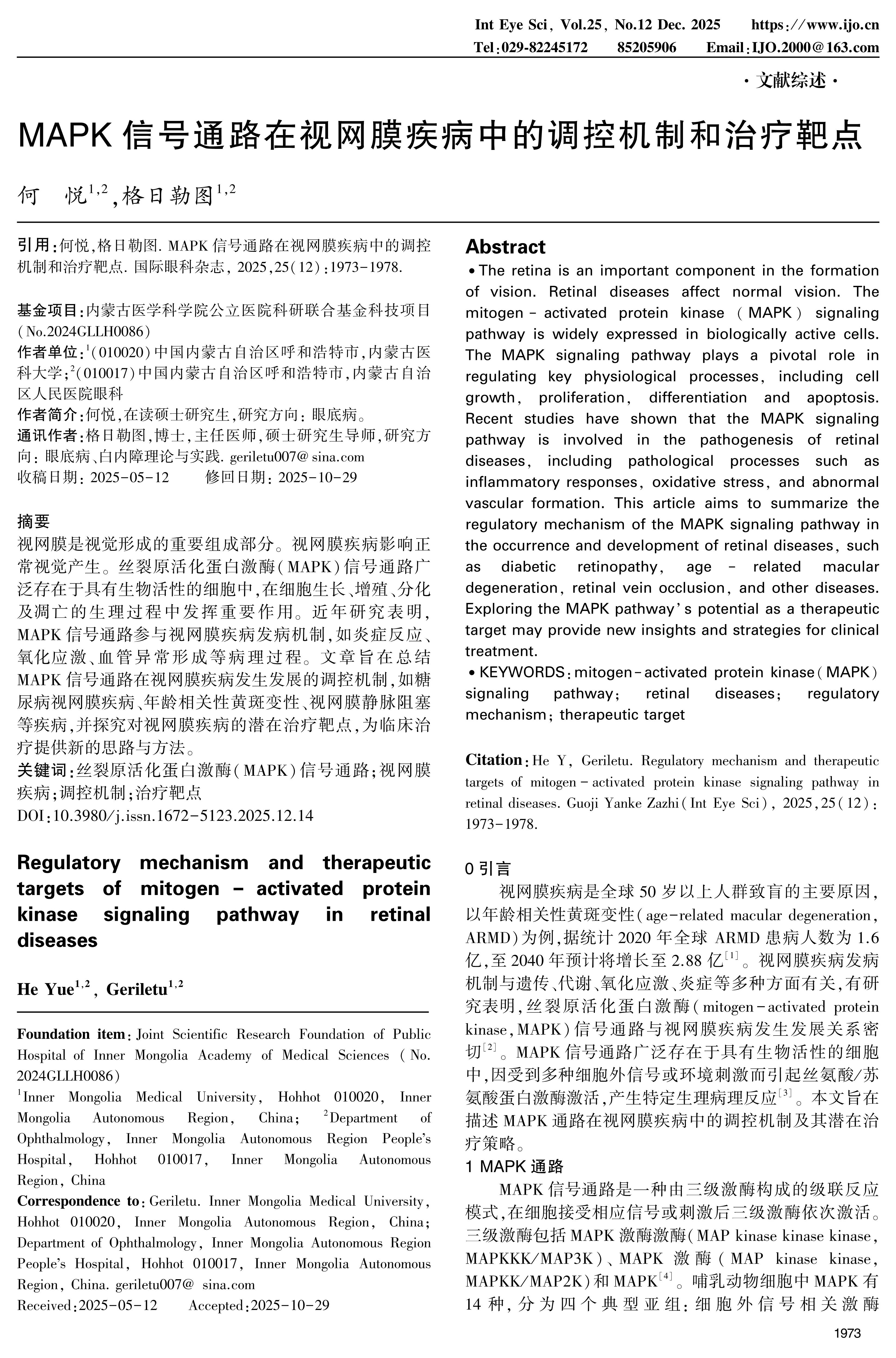 视网膜是视觉形成的重要组成部分。视网膜疾病影响正常视觉产生。丝裂原活化蛋白激酶(MAPK)信号通路广泛存在于具有生物活性的细胞中,在细胞生长、增殖、分化及凋亡的生理过程中发挥重要作用。近年研究表明,MAPK信号通路参与视网膜疾病发病机制,如炎症反应、氧化应激、血管异常形成等病理过程。文章旨在总结 MAPK信号通路在视网膜疾病发生发展的调控机制,如糖尿病视网膜疾病、年龄相关性黄斑变性、视网膜静脉阻塞等疾病,并探究对视网膜疾病的潜在治疗靶点,为临床治疗提供新的思路与方法。