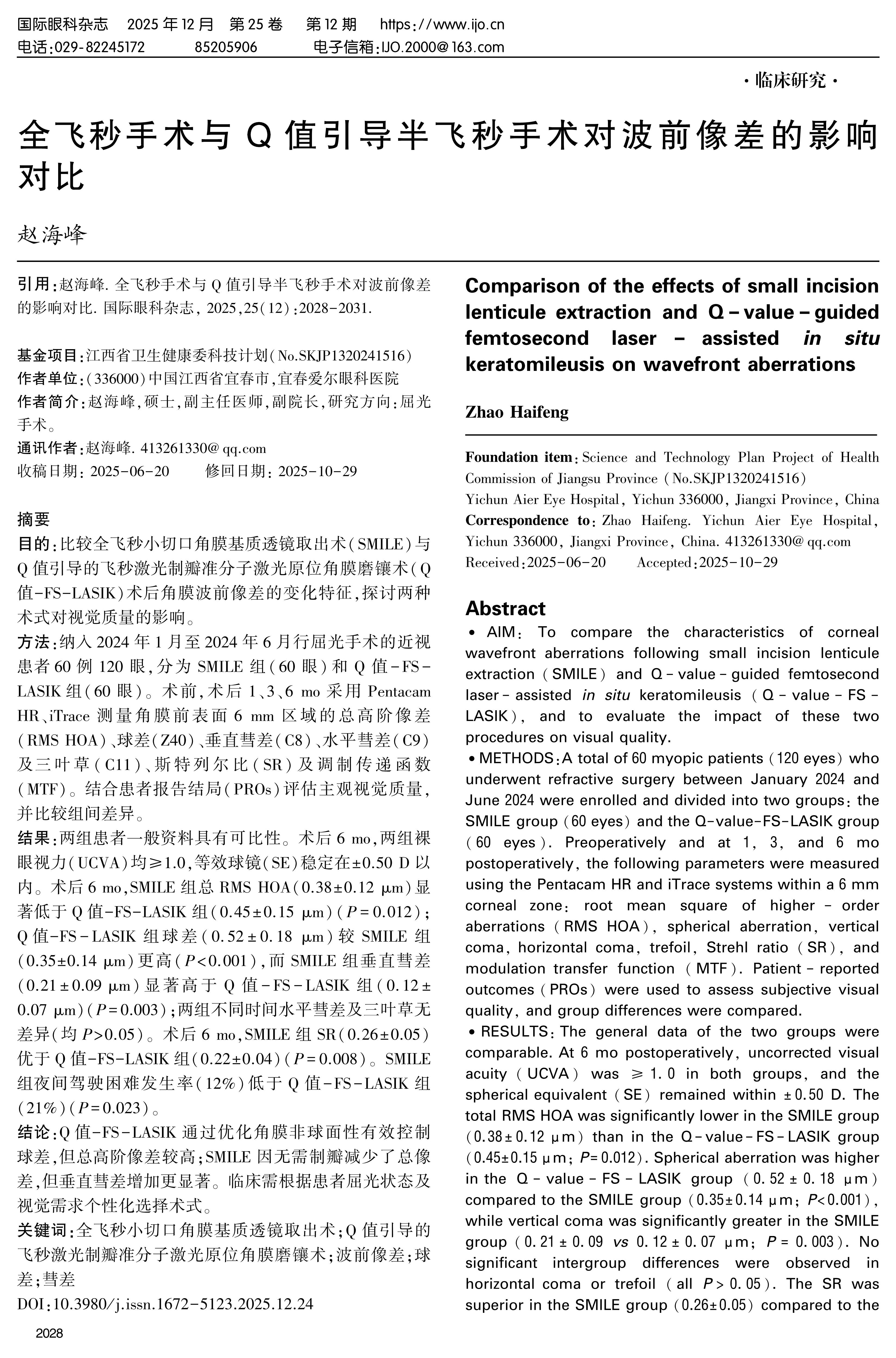RESULTS:The general data of the two groups were comparable. At 6 mo postoperatively, uncorrected visual acuity(UCVA)was ≥1.0 in both groups, and the spherical equivalent(SE)remained within ±0.50 D. The total RMS HOA was significantly lower in the SMILE group(0.38±0.12 μm)than in the Q-value-FS-LASIK group(0.45±0.15 μm; P=0.012). Spherical aberration was higher in the Q-value-FS-LASIK group(0.52±0.18 μm)compared to the SMILE group(0.35±0.14 μm; P<0.001), while vertical coma was significantly greater in the SMILE group(0.21±0.09 vs 0.12±0.07 μm; P=0.003). No significant intergroup differences were observed in horizontal coma or trefoil(all P>0.05). The SR was superior in the SMILE group(0.26±0.05)compared to the Q-value-FS-LASIK group(0.22±0.04; P=0.008). PROs indicated a lower incidence of nighttime driving difficulties in the SMILE group(12% vs 21%; P=0.023).
