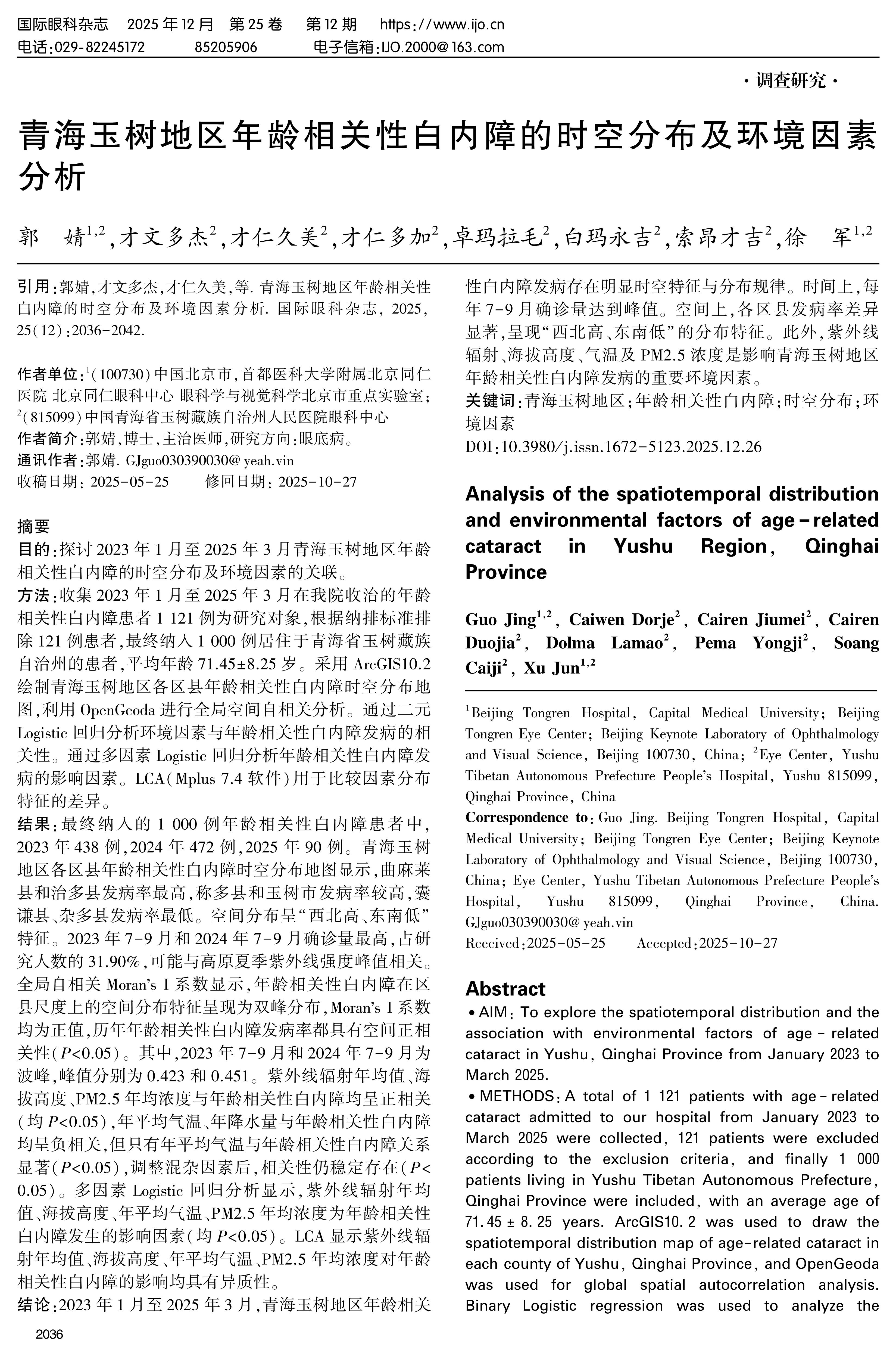 目的:探讨2023年1月至2025年3月青海玉树地区年龄相关性白内障的时空分布及环境因素的关联。