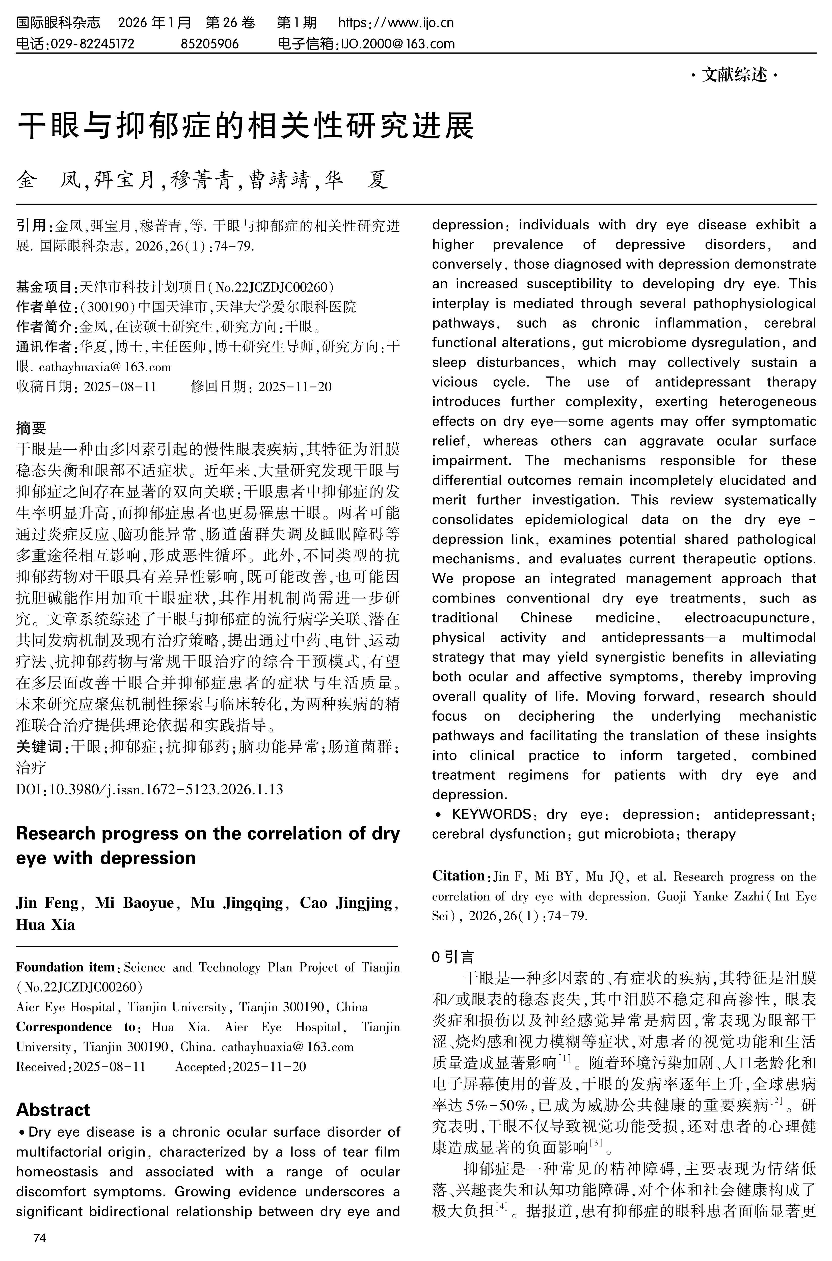 干眼是一种由多因素引起的慢性眼表疾病,其特征为泪膜稳态失衡和眼部不适症状。近年来,大量研究发现干眼与抑郁症之间存在显著的双向关联:干眼患者中抑郁症的发生率明显升高,而抑郁症患者也更易罹患干眼。两者可能通过炎症反应、脑功能异常、肠道菌群失调及睡眠障碍等多重途径相互影响,形成恶性循环。此外,不同类型的抗抑郁药物对干眼具有差异性影响,既可能改善,也可能因抗胆碱能作用加重干眼症状,其作用机制尚需进一步研究。文章系统综述了干眼与抑郁症的流行病学关联、潜在共同发病机制及现有治疗策略,提出通过中药、电针、运动疗法、抗抑郁药物与常规干眼治疗的综合干预模式,有望在多层面改善干眼合并抑郁症患者的症状与生活质量。未来研究应聚焦机制性探索与临床转化,为两种疾病的精准联合治疗提供理论依据和实践指导。