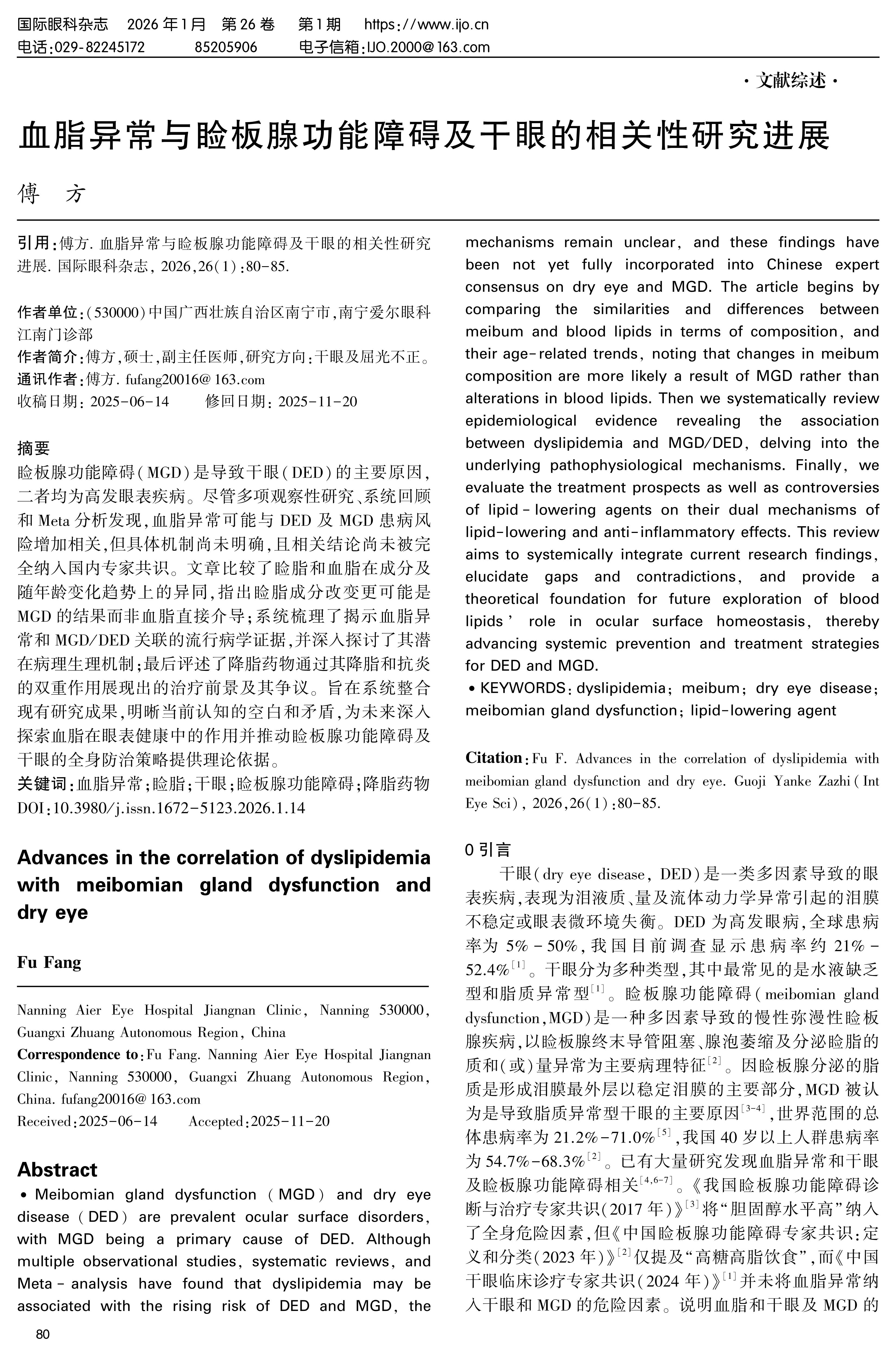 睑板腺功能障碍(MGD)是导致干眼(DED)的主要原因,二者均为高发眼表疾病。尽管多项观察性研究、系统回顾和Meta分析发现,血脂异常可能与DED及MGD患病风险增加相关,但具体机制尚未明确,且相关结论尚未被完全纳入国内专家共识。文章比较了睑脂和血脂在成分及随年龄变化趋势上的异同,指出睑脂成分改变更可能是MGD的结果而非血脂直接介导; 系统梳理了揭示血脂异常和MGD/DED关联的流行病学证据,并深入探讨了其潜在病理生理机制; 最后评述了降脂药物通过其降脂和抗炎的双重作用展现出的治疗前景及其争议。旨在系统整合现有研究成果,明晰当前认知的空白和矛盾,为未来深入探索血脂在眼表健康中的作用并推动睑板腺功能障碍及干眼的全身防治策略提供理论依据。