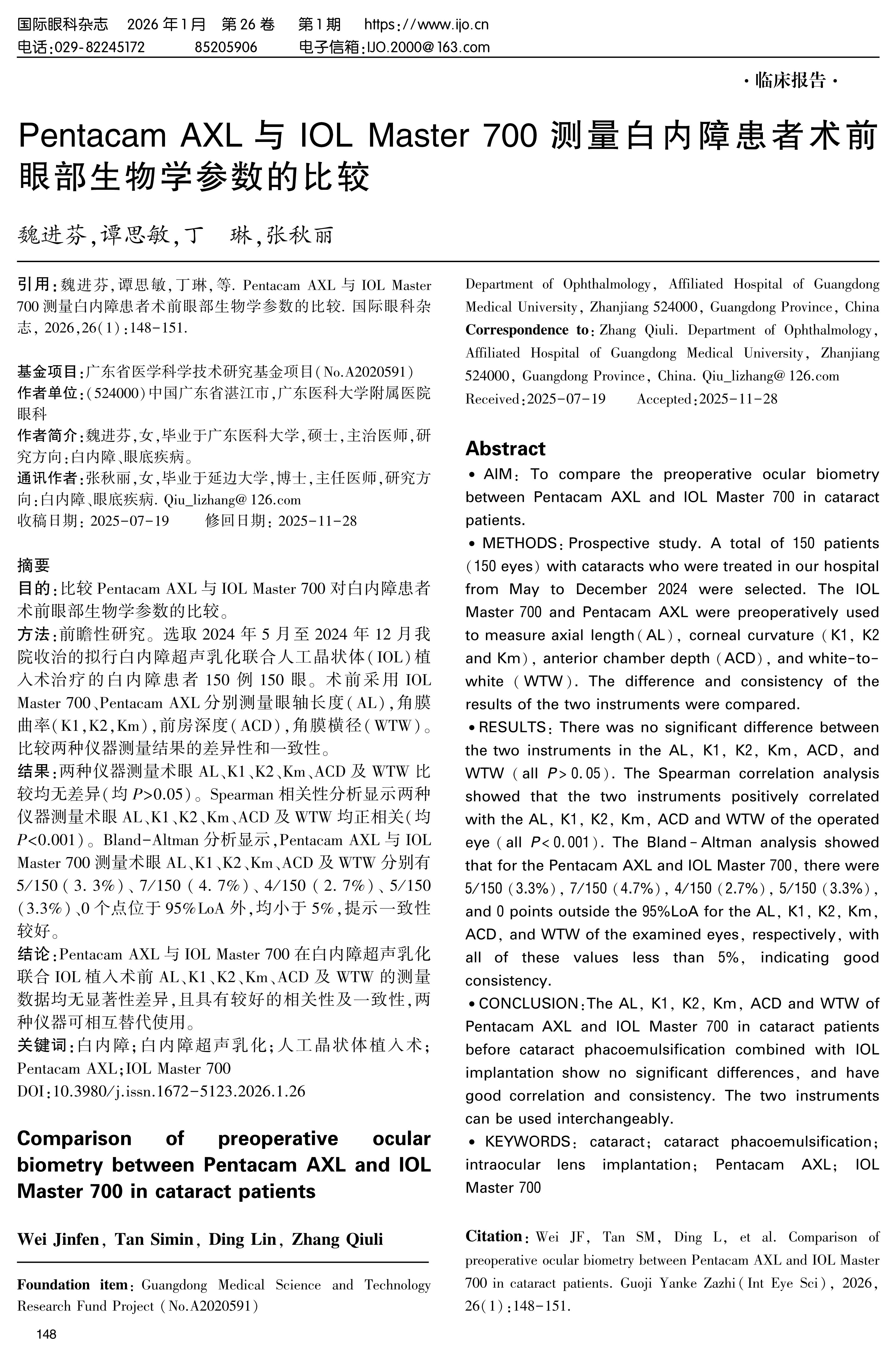方法:前瞻性研究。选取2024年5月至2024年12月我院收治的拟行白内障超声乳化联合人工晶状体(IOL)植入术治疗的白内障患者150例150眼。术前采用IOL Master 700、Pentacam AXL分别测量眼轴长度(AL),角膜曲率(K1,K2,Km),前房深度(ACD),角膜横径(WTW)。比较两种仪器测量结果的差异性和一致性。